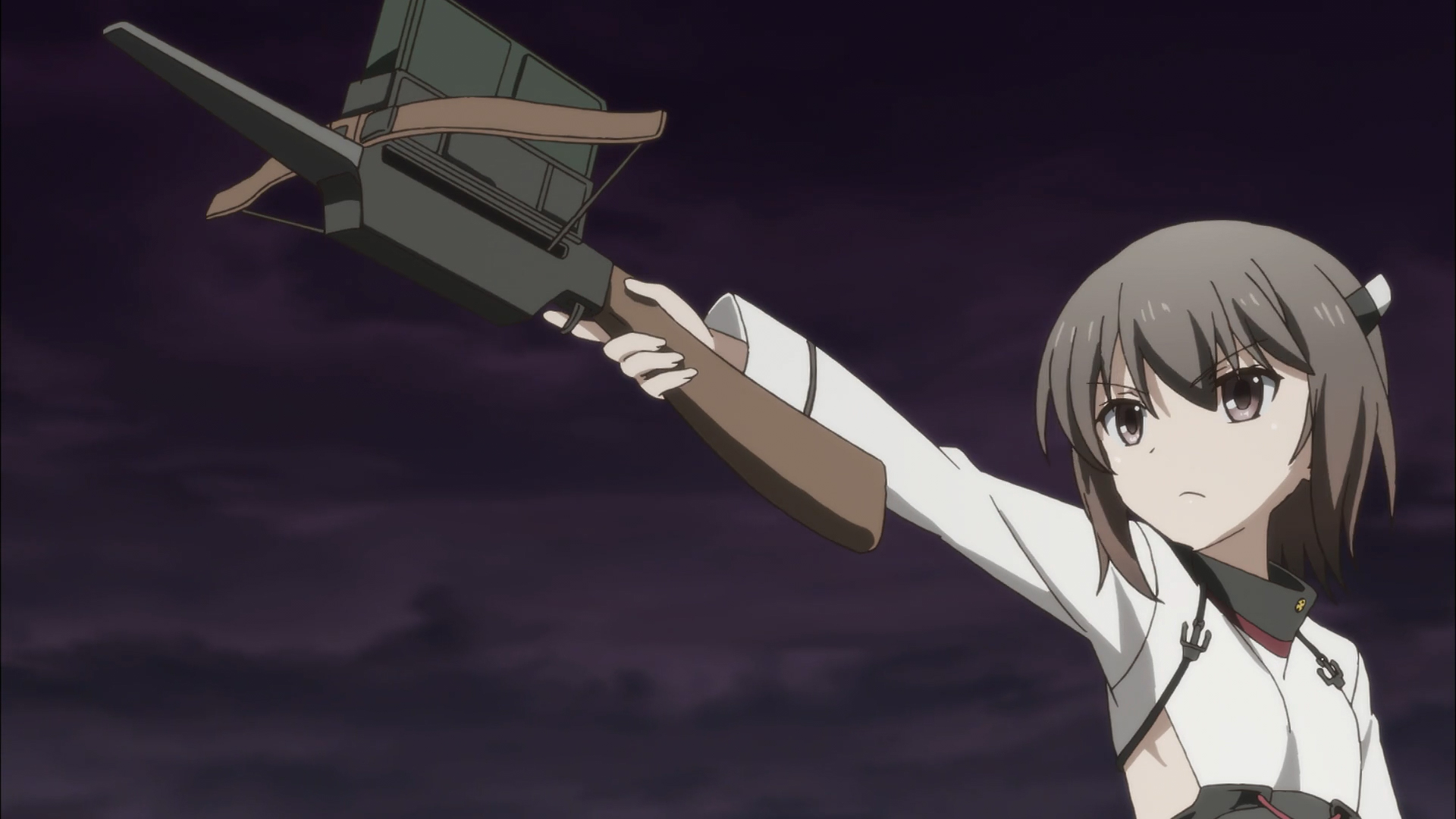 Description: A girl holding a gun in the air with a cloudy background behind her and a purple sky behind her.