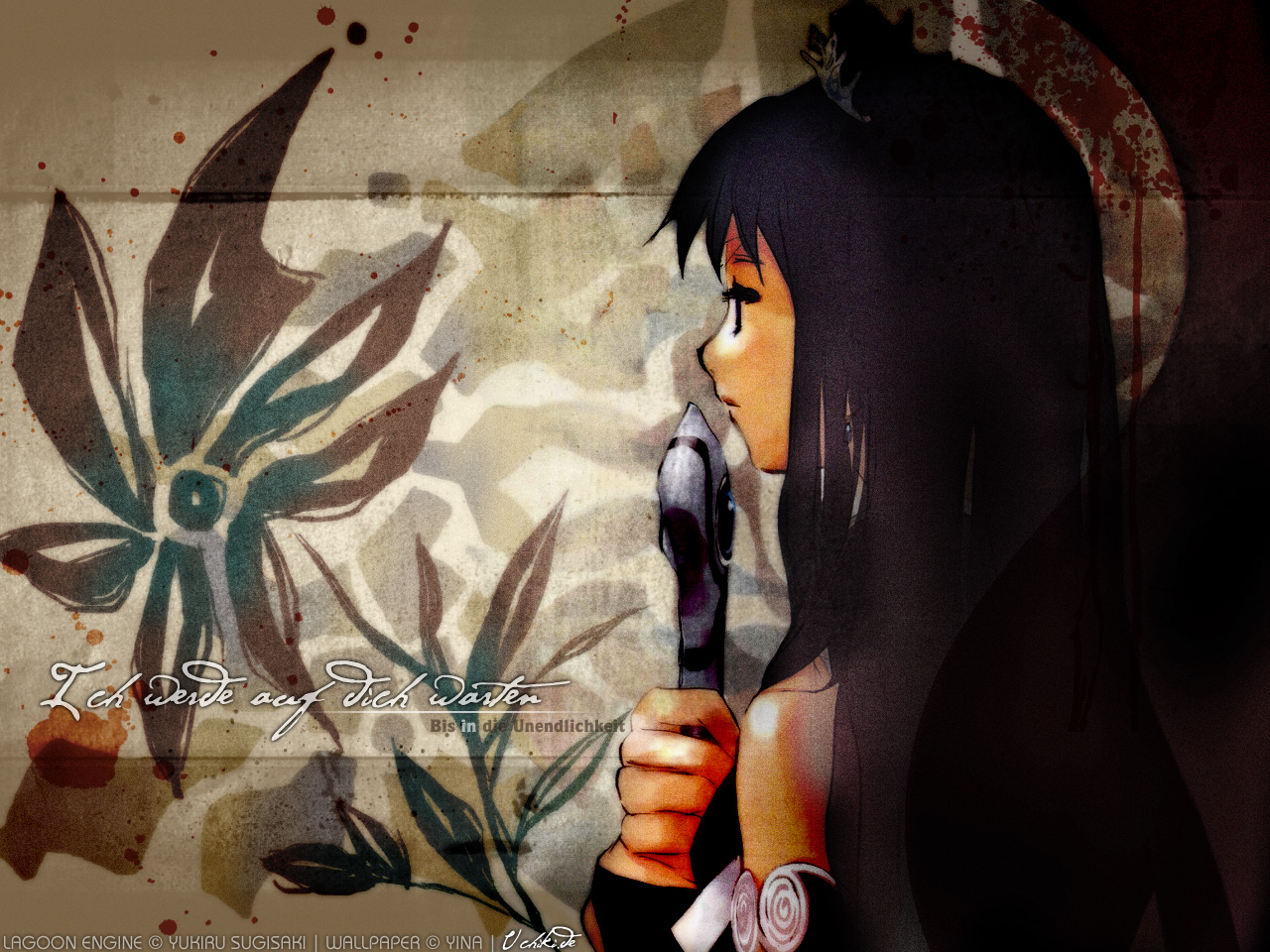 Description: A girl holding a hair dryer in her hand and looking at a flower on the wall behind her.