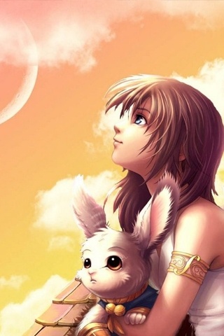Description: A girl holding a rabbit in her arms in the sky with a half moon in the background and a half moon in the sky.