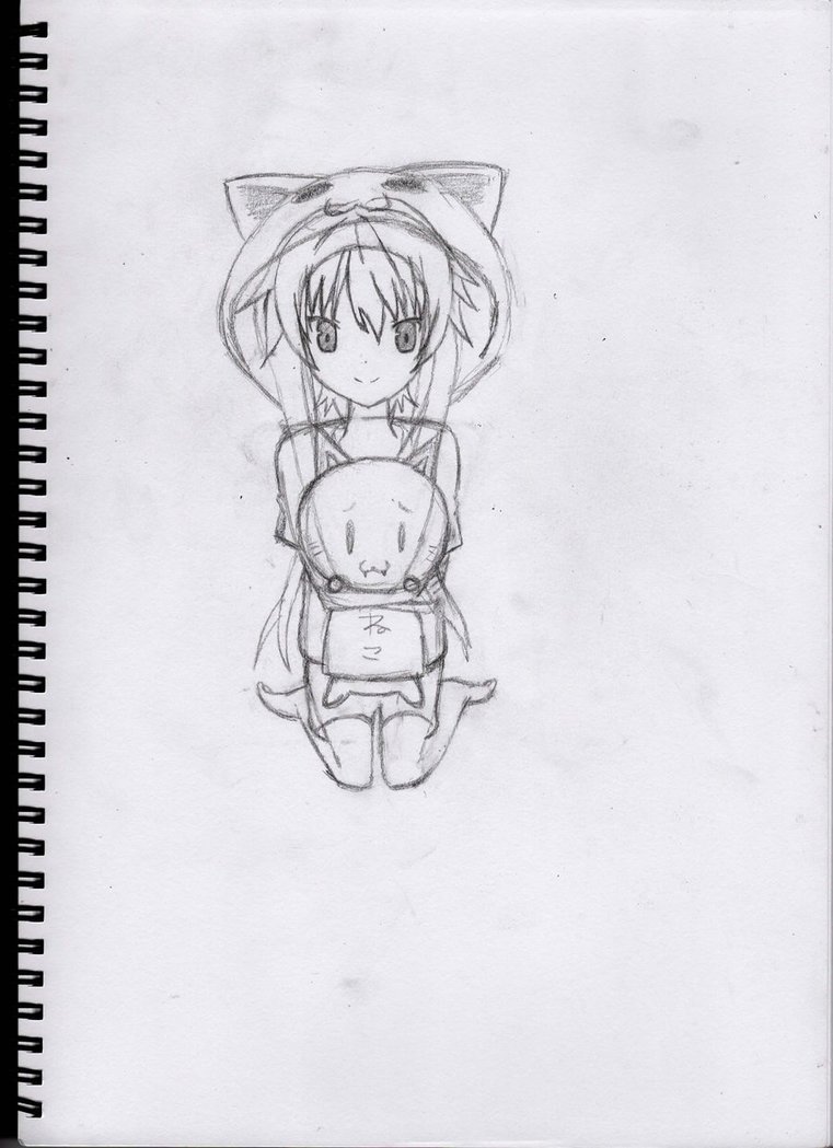 Description: A drawing of a girl holding a teddy bear in her arms with a hat on her head and a cat on her shoulder.