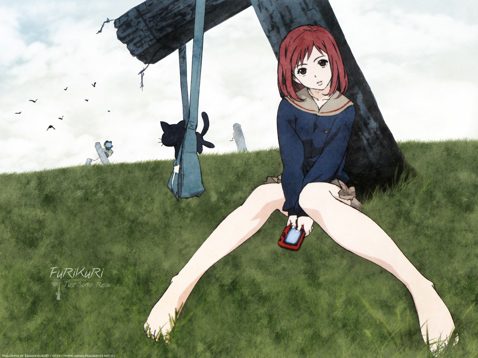 Description: A girl sitting in the grass with a cell phone in her hand and a cat in the background.