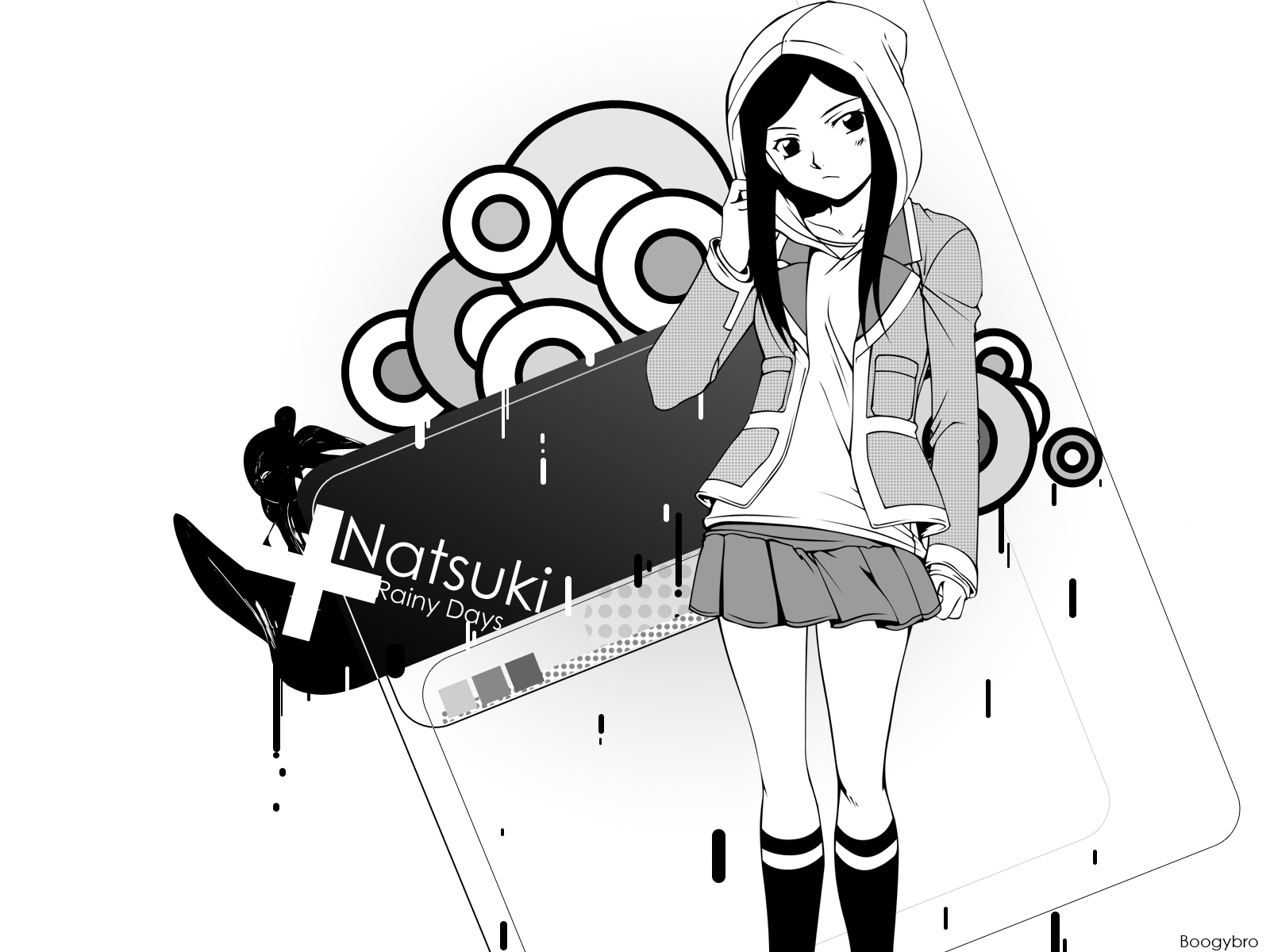 Description: A girl in a hoodie holding a skateboard in front of a wall with a cloud of circles.