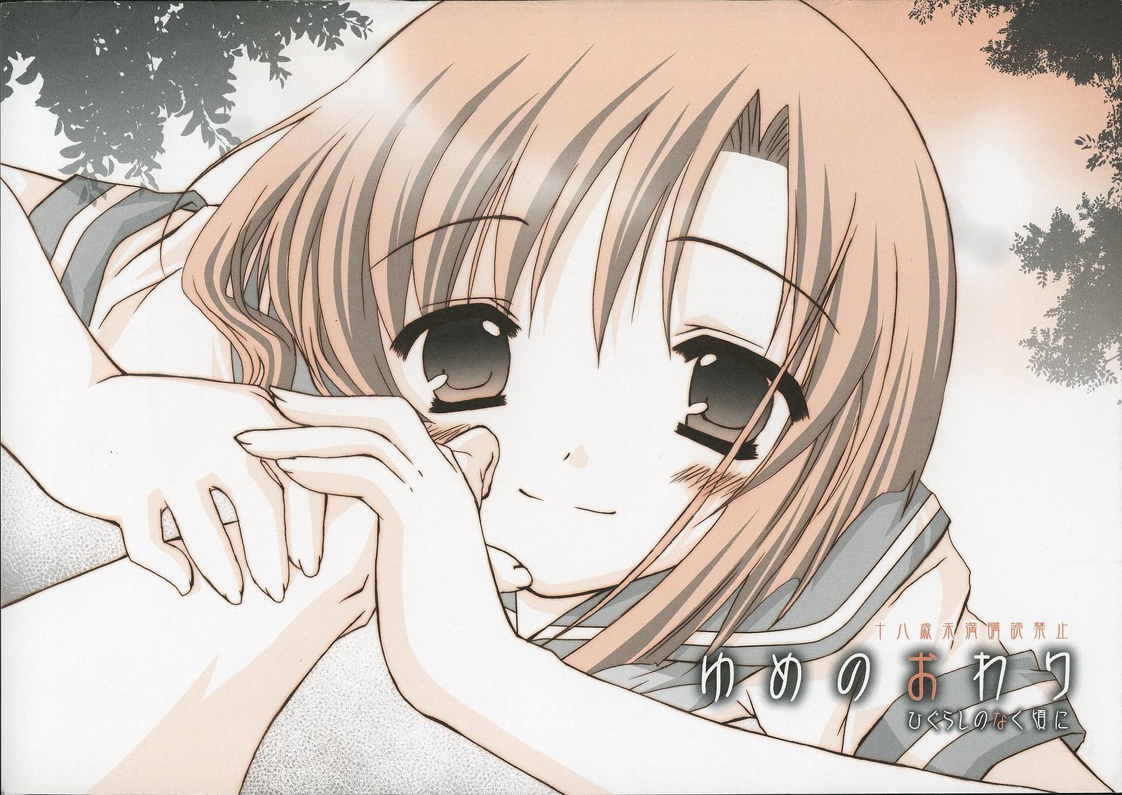 Description: A girl with long hair and big eyes hugging another girl's shoulder with trees in the background and a pink sky.
