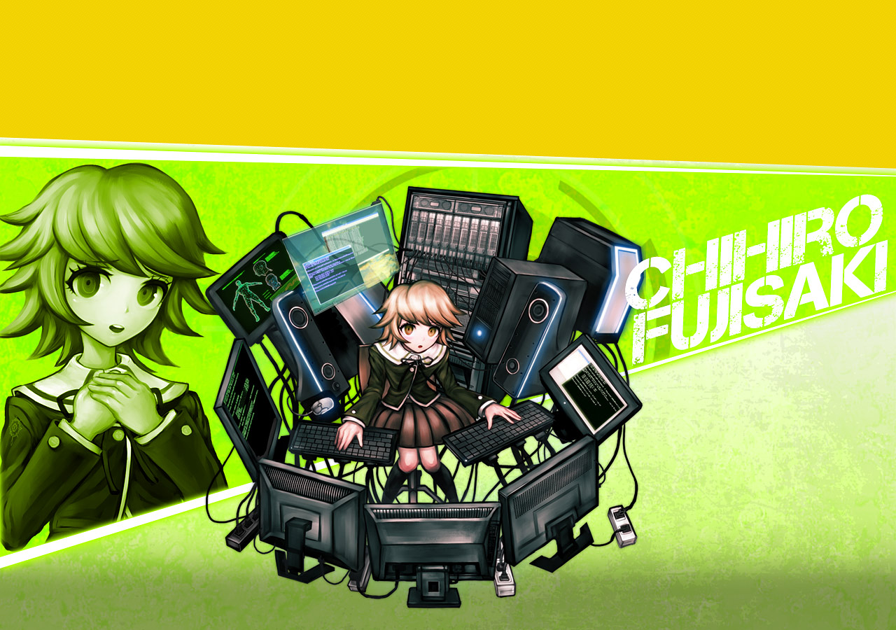 Description: A girl sitting on a keyboard surrounded by electronic equipment and a green background with a yellow border over it.