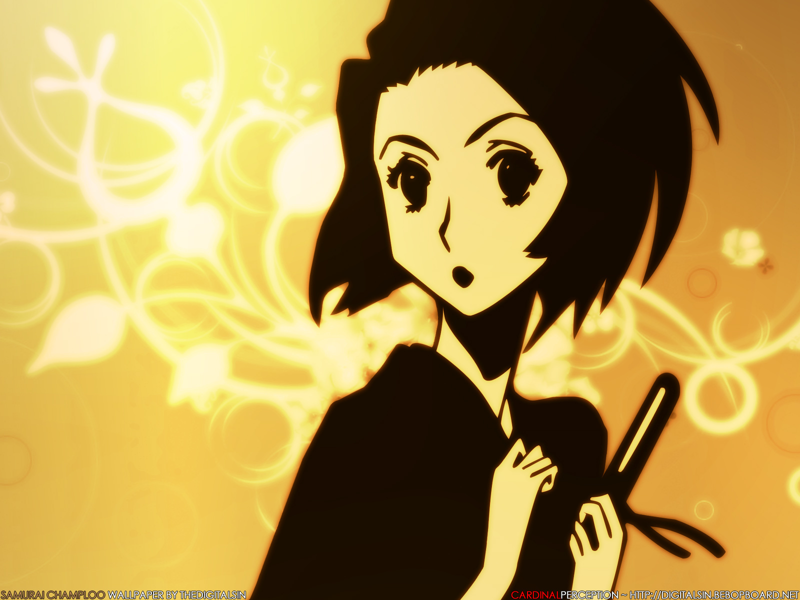 Description: A girl with a knife in her hand and a yellow background behind her is a flower pattern with swirls.