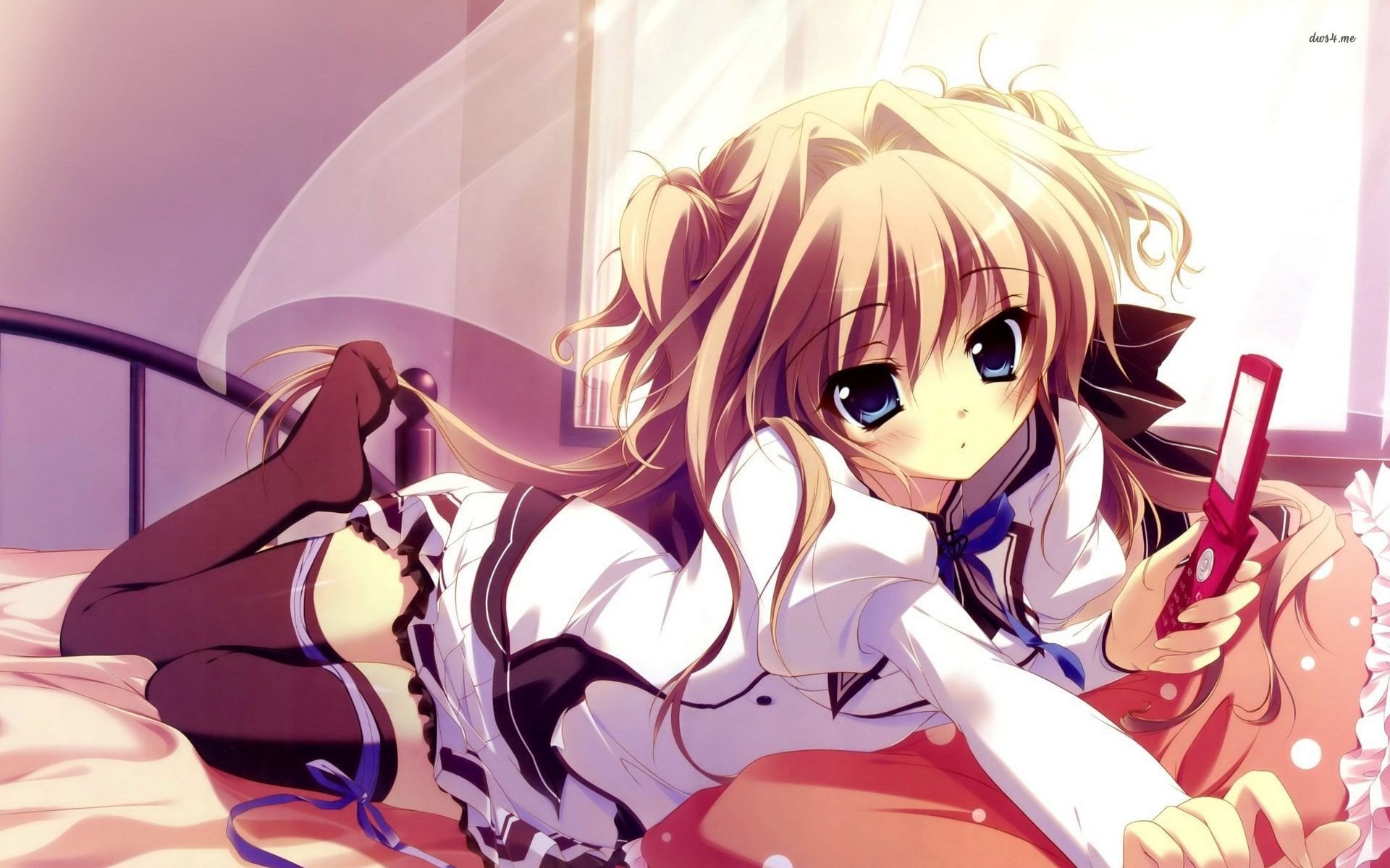 Description: A girl laying on a bed with a cell phone in her hand and a pink background behind her is a window.