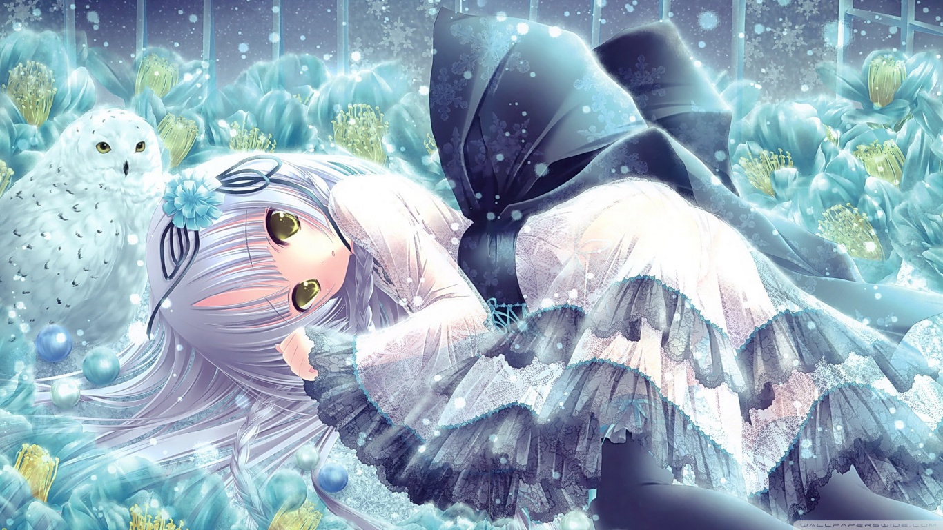 Description: A girl laying on her back in the snow with an owl nearby on her shoulder and a bird on her shoulder.