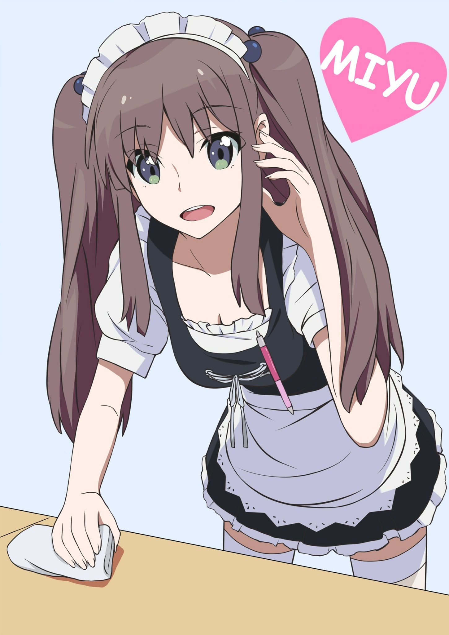 Description: A girl with long hair and a white shirt is leaning on a table and holding a mouse in her hand.