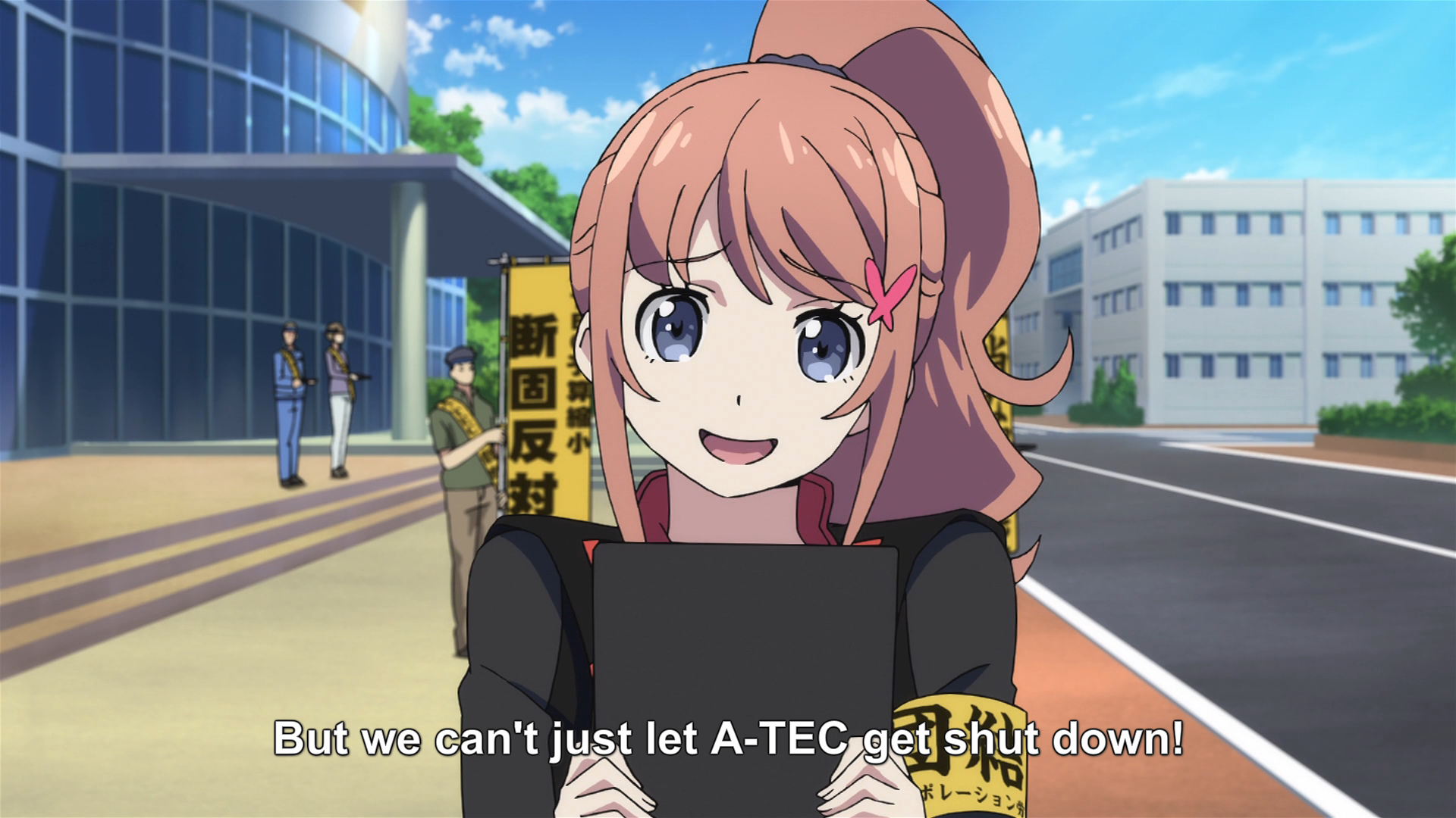 Description: A girl with long hair and a black shirt is holding a tablet computer in a city street with people walking by.