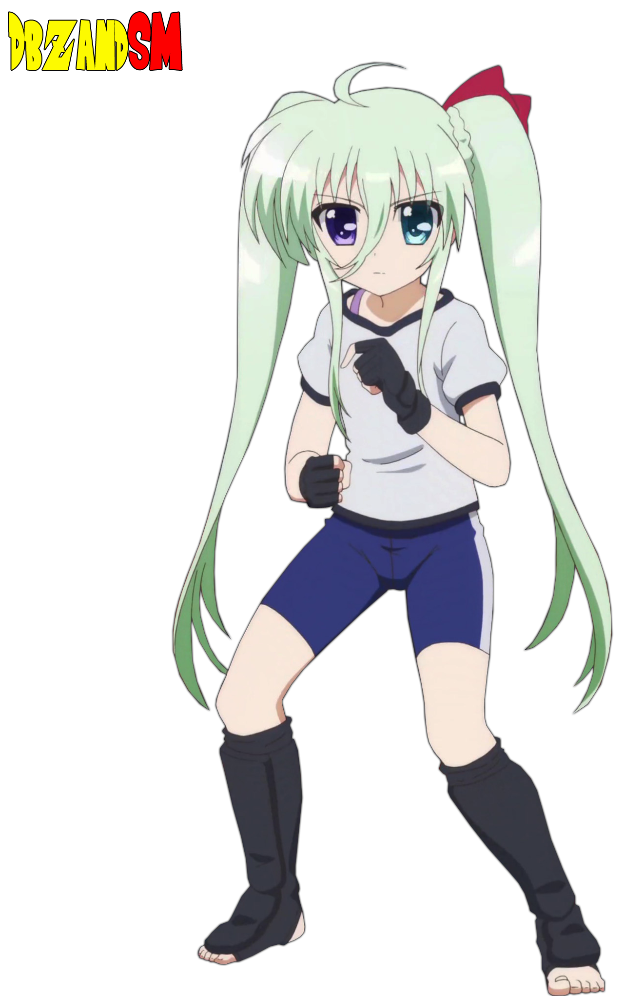 Description: A girl with long hair and boots standing in front of a white background with a black and red sign.
