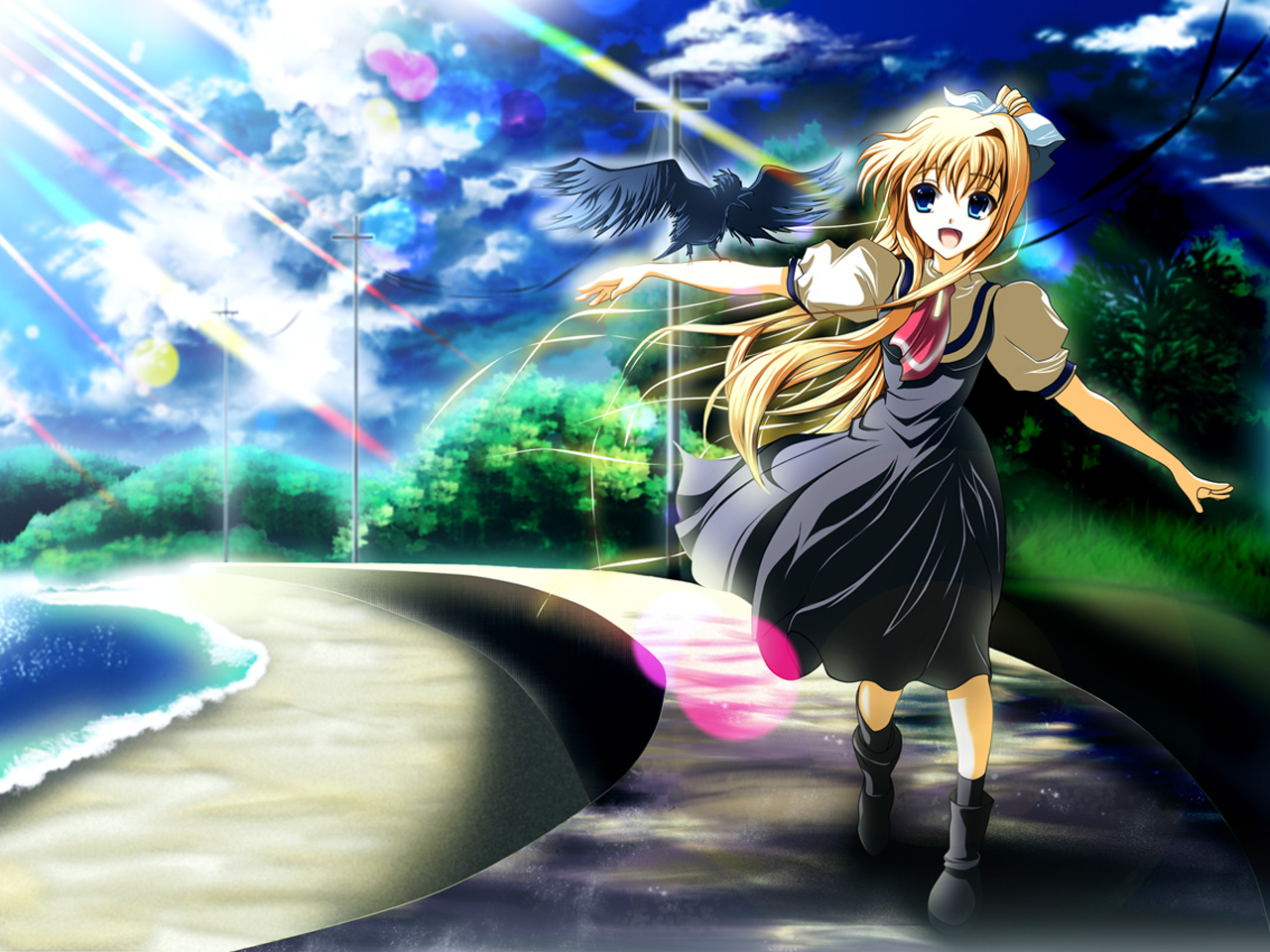 Description: A girl with long hair and a dress is walking on a path near the ocean and a bird flying overhead.