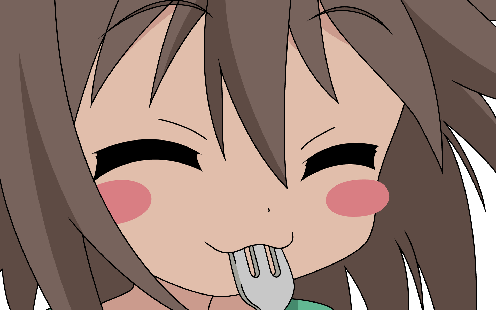 Description: A girl with long hair and a fork in her mouth is eating something with her hand and looking at the camera.