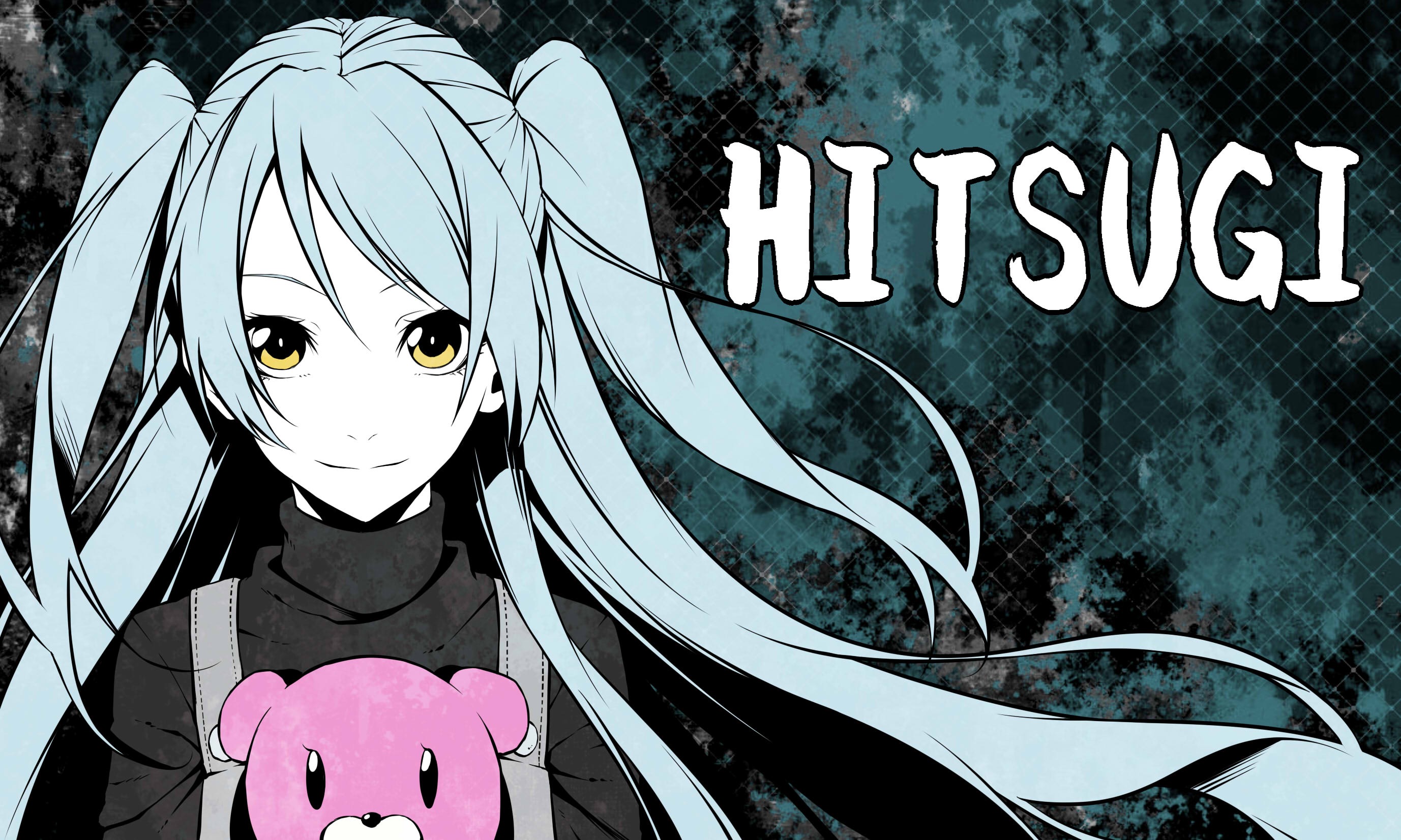 Description: A girl with long hair holding a pink teddy bear in her hands and the words hitsugi on the background.