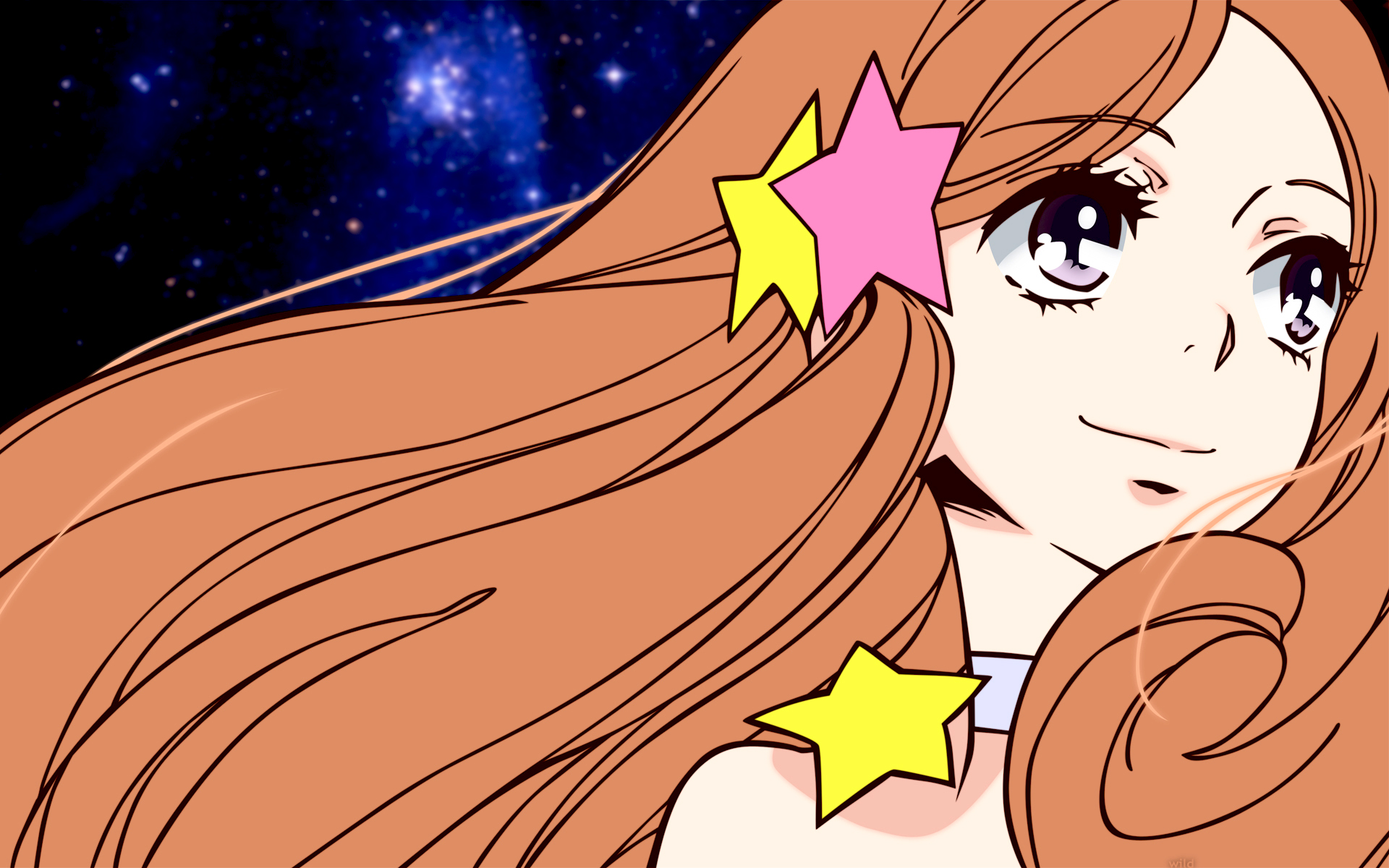 Description: A girl with long hair and stars on her forehead looking at the stars in the sky above her head.