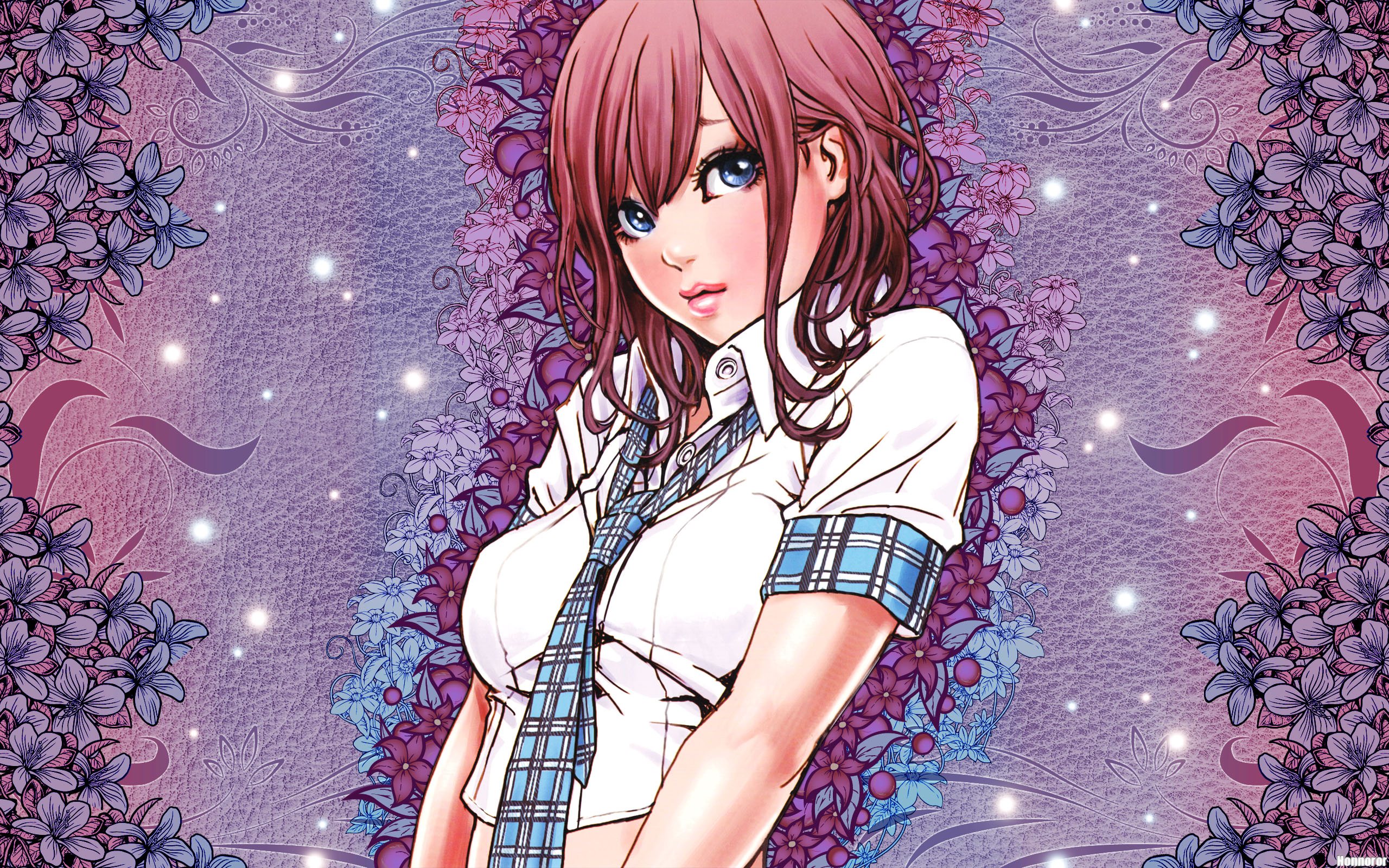 Description: A girl with long hair and a tie standing in front of a purple background with flowers and stars on it.