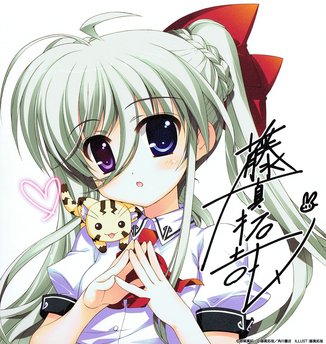 Description: A girl with long white hair holding a cat in her hands and a cat in her hand with a cat in her hand.