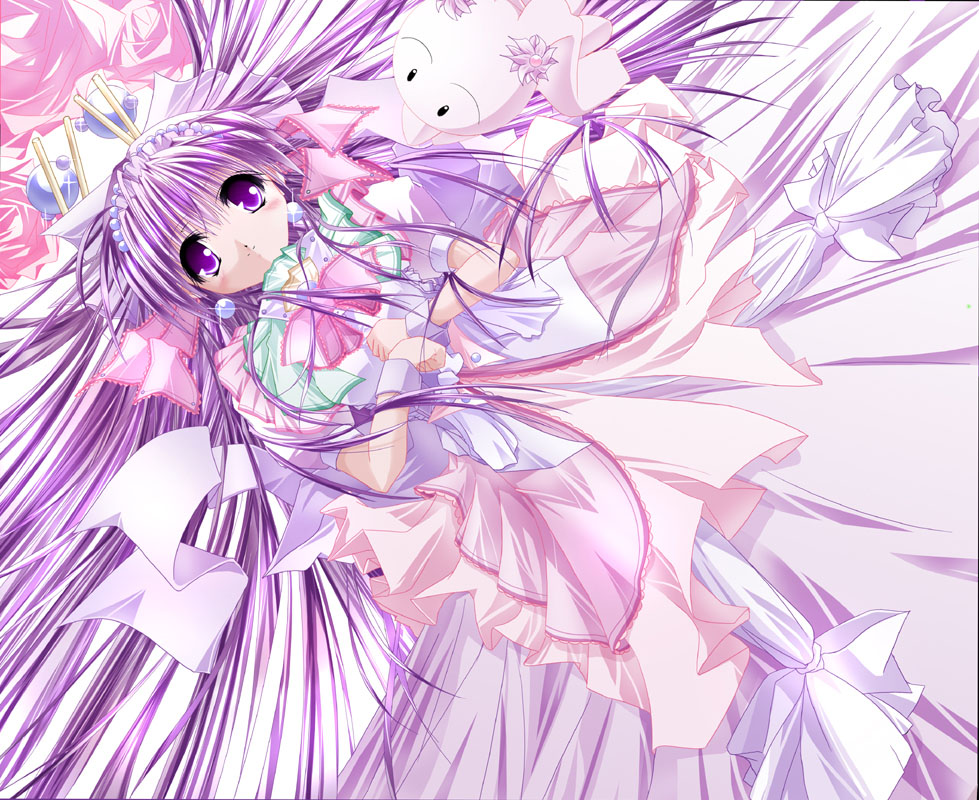 Description: A girl with long hair and a flowered dress is holding a teddy bear in her arms and a pink background.