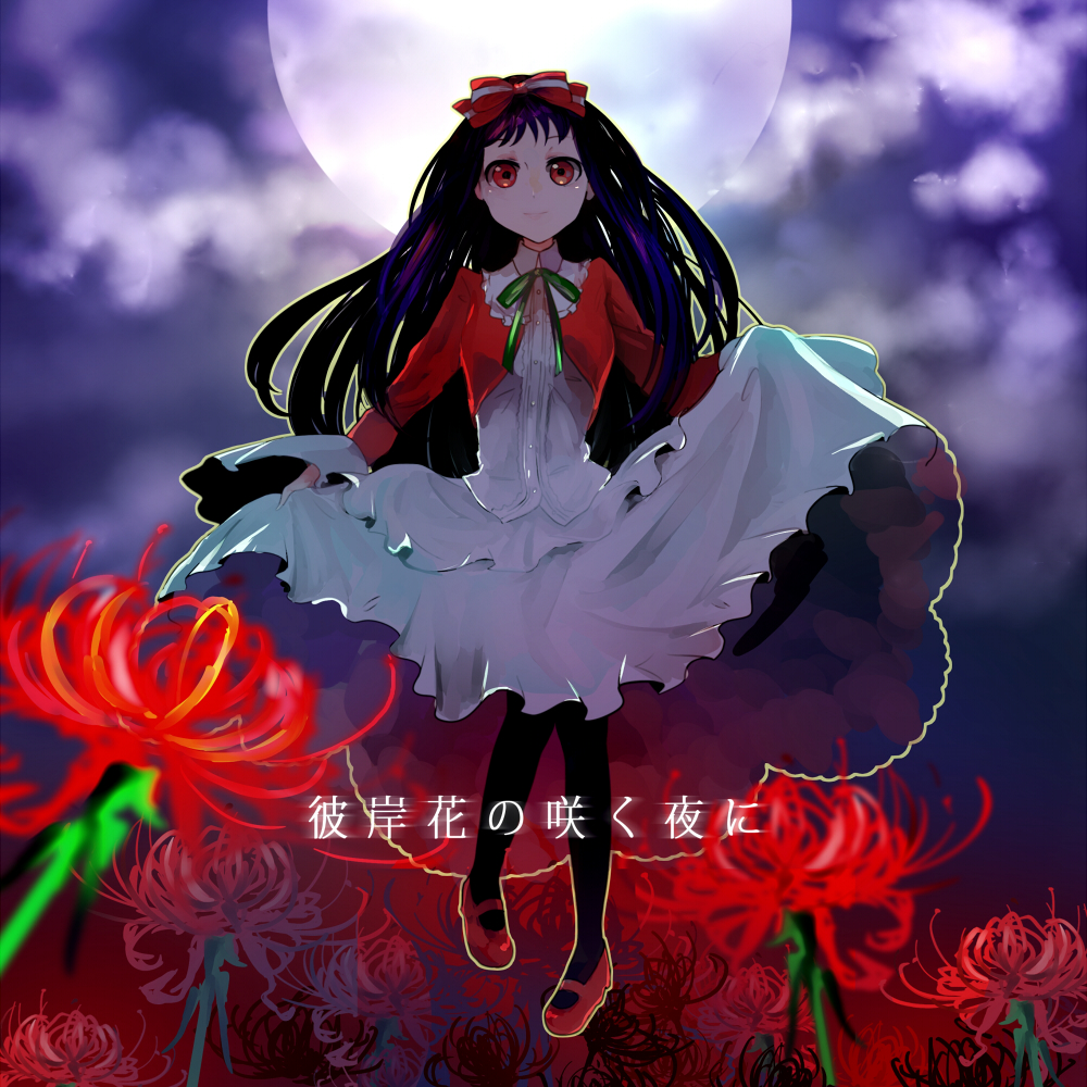 Description: A girl in a white dress is sitting on a flower with a full moon in the background and a red flower in the foreground.