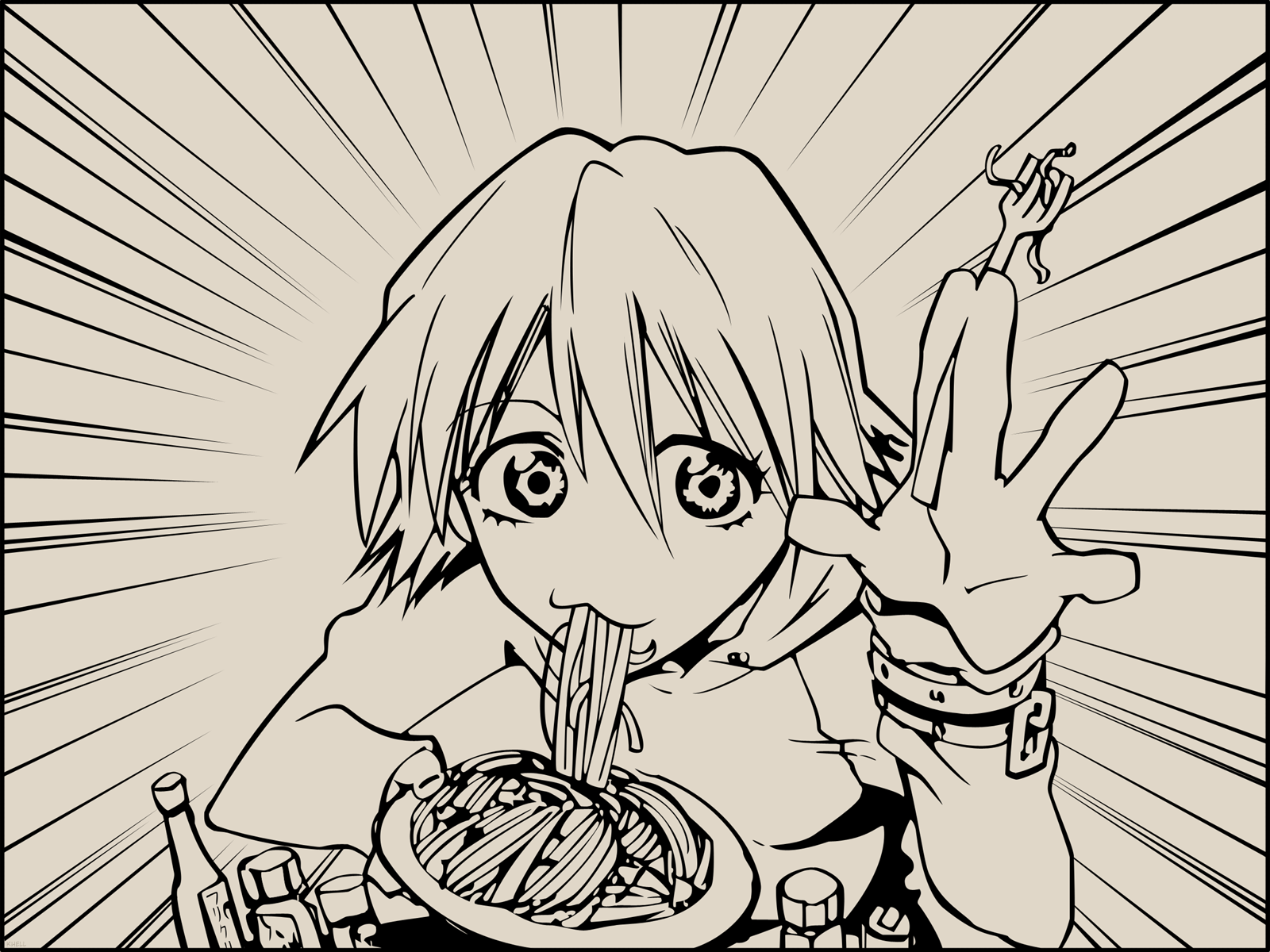 Description: A drawing of a girl holding a bowl of noodles with her hand up to her face and a hand holding a bowl of noodles.
