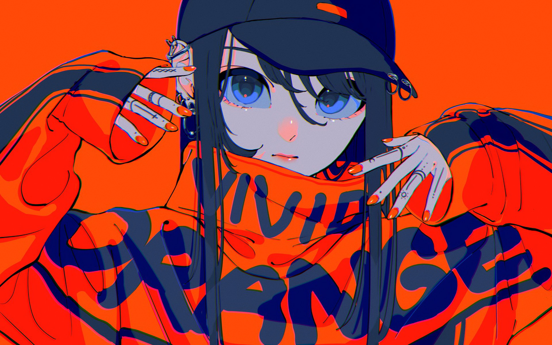 Description: A girl with a baseball cap and orange shirt and a baseball cap on her head and a baseball glove on her shoulder.