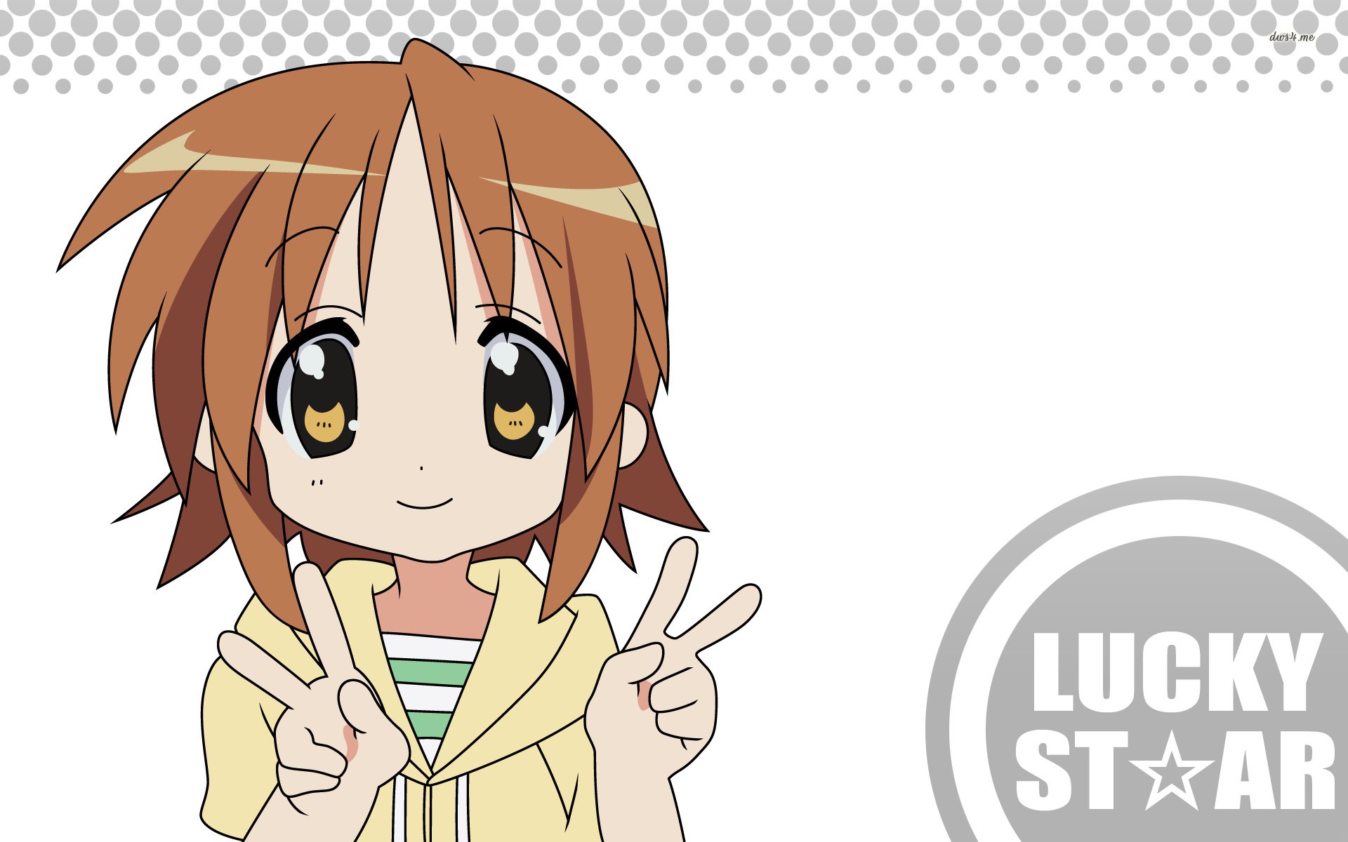 Description: A girl with brown hair and a yellow jacket is giving the peace sign with her hand and a lucky star sign in front of her.