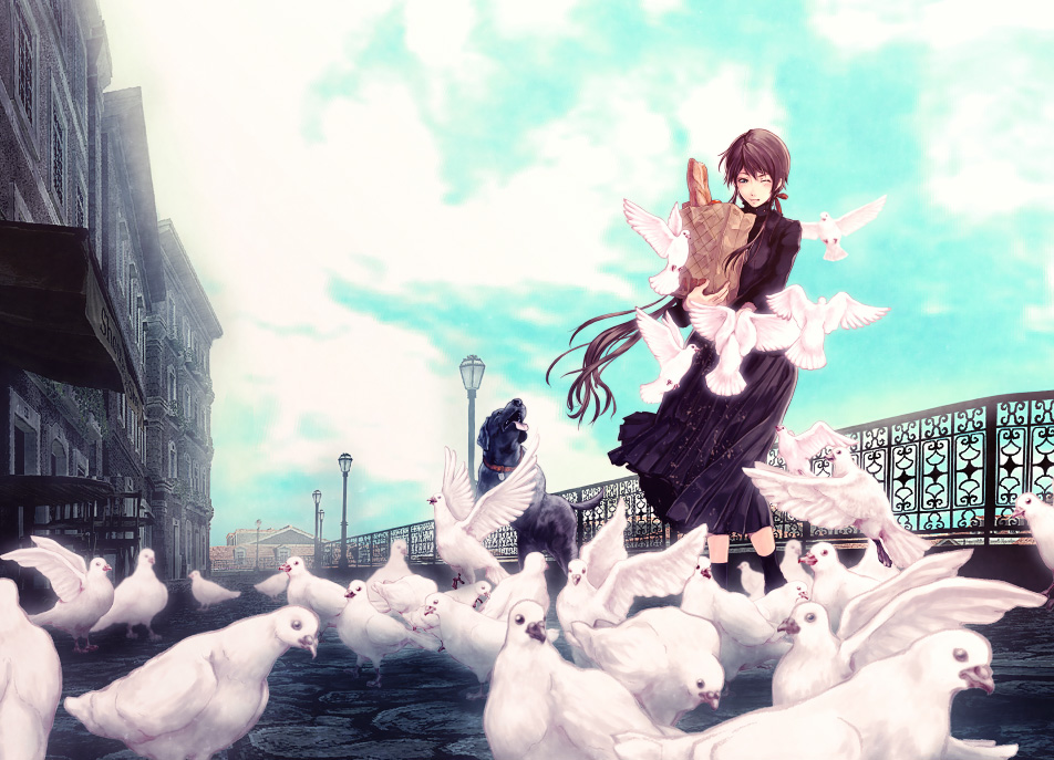 Description: A girl is walking among a flock of white pigeons in a city street with a man in the background.
