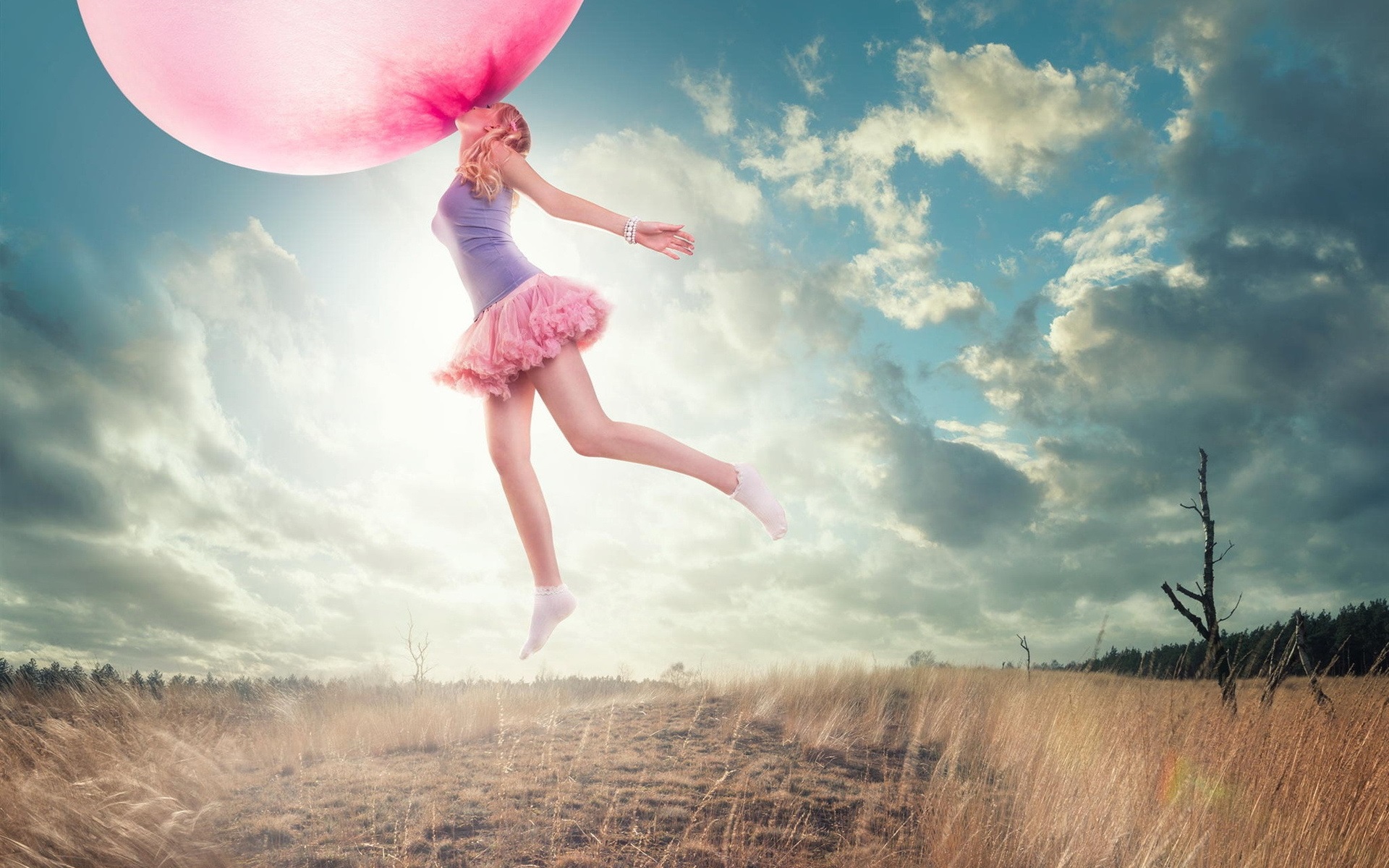 Description: A girl in a pink dress holding a pink balloon in the air with a sky background and clouds in the background.