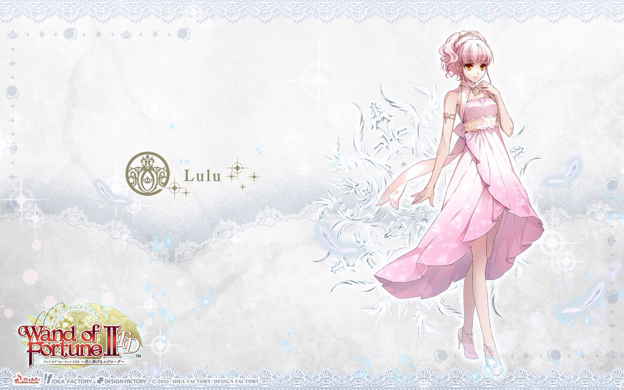 Description: A girl in a pink dress is standing in front of a white background with a blue border and a white cross.