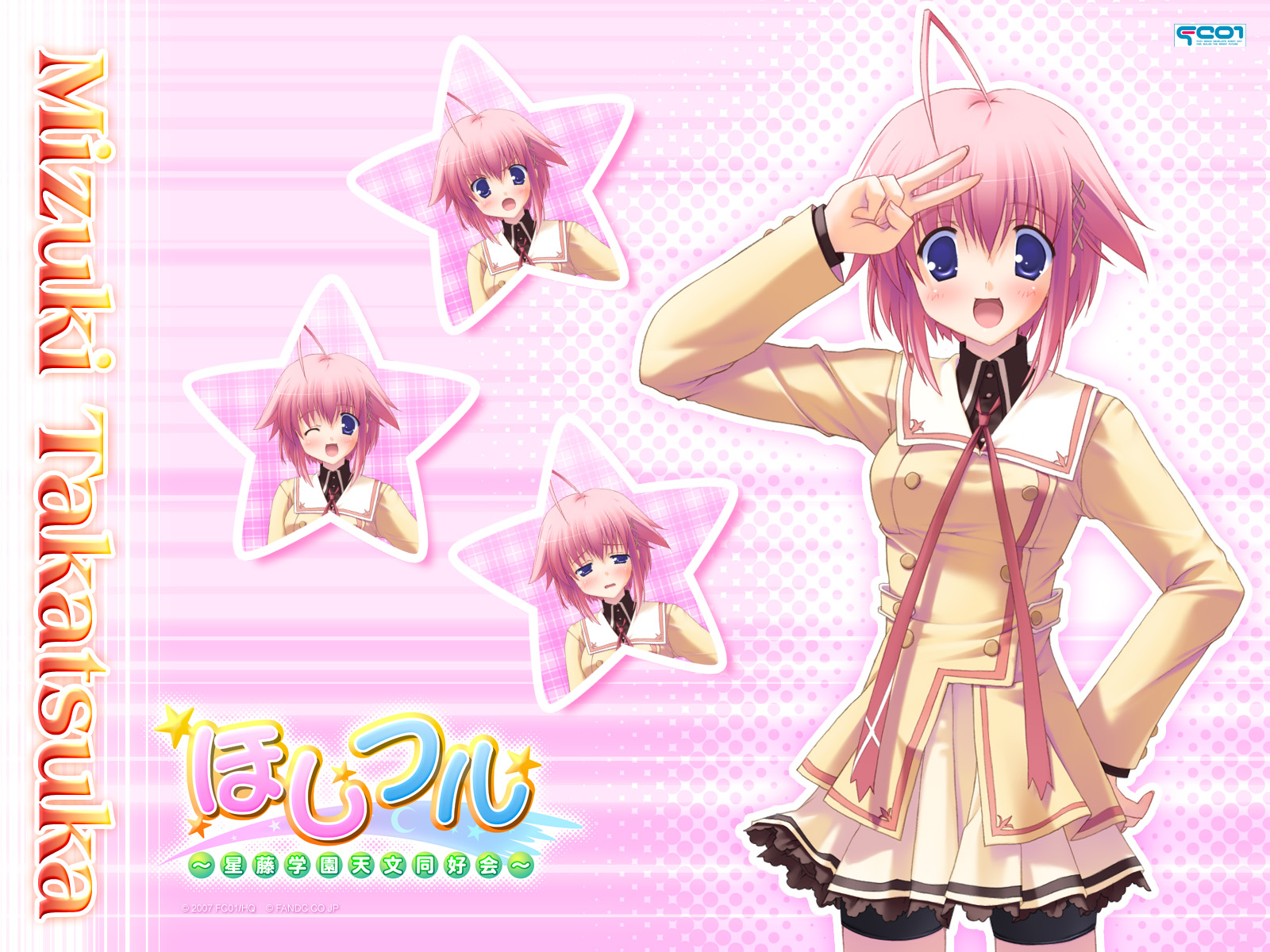 Description: A girl in a short dress with a pink hair and a star on her head and a pink background.