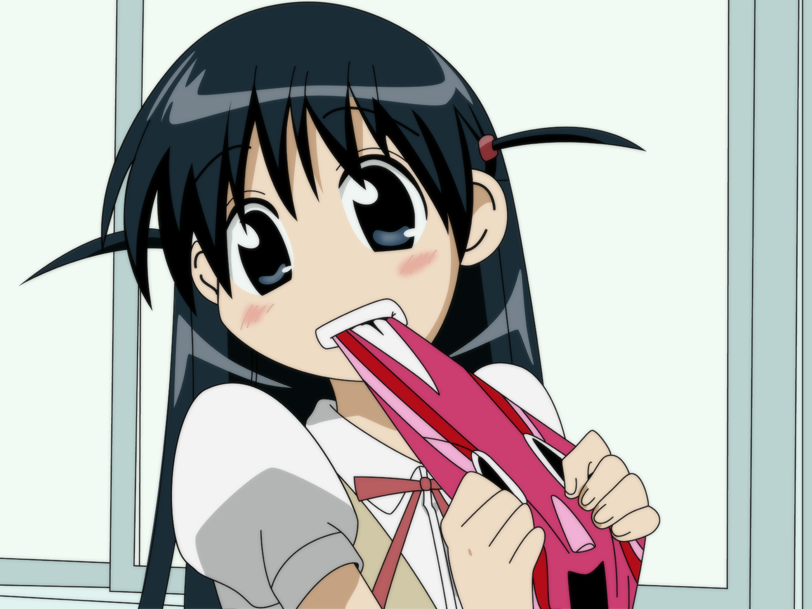 Description: A girl holding a pink object in her hand and a toothbrush in her mouth with a toothbrush in her mouth.