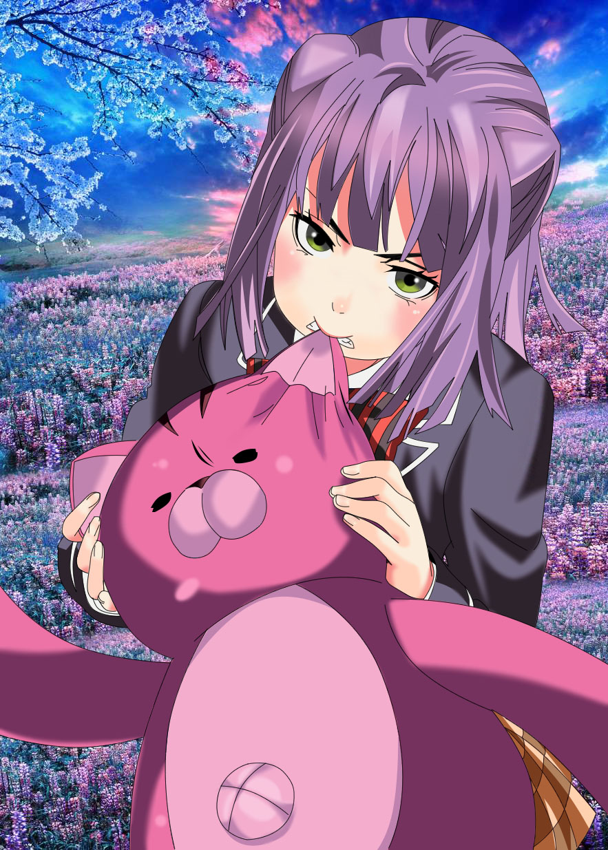 Description: A girl holding a pink teddy bear in a field of flowers with a sky background and trees in the background.
