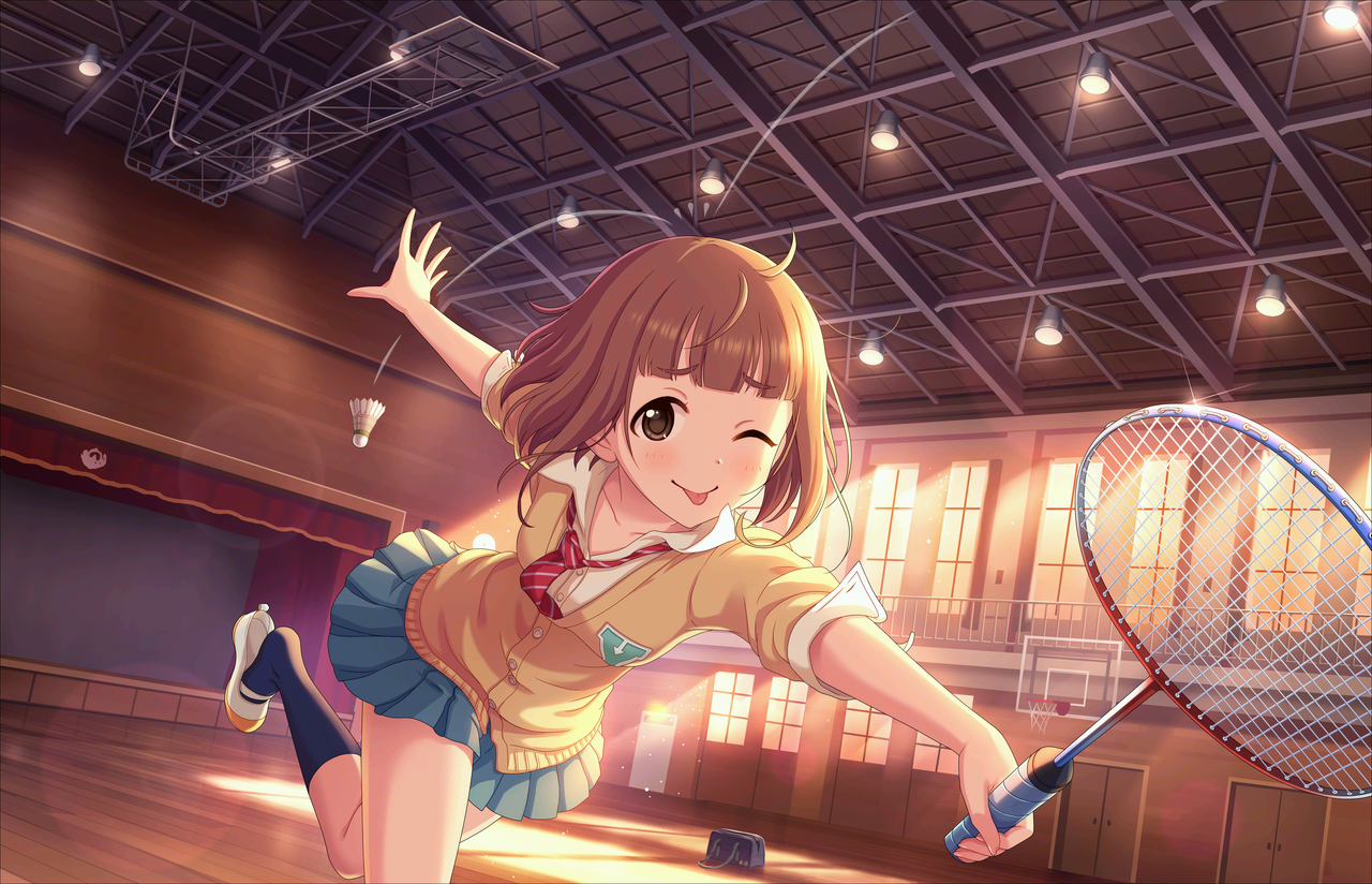 Description: A girl is playing tennis in a large room with lights on the ceiling and a tennis racket in her hand.