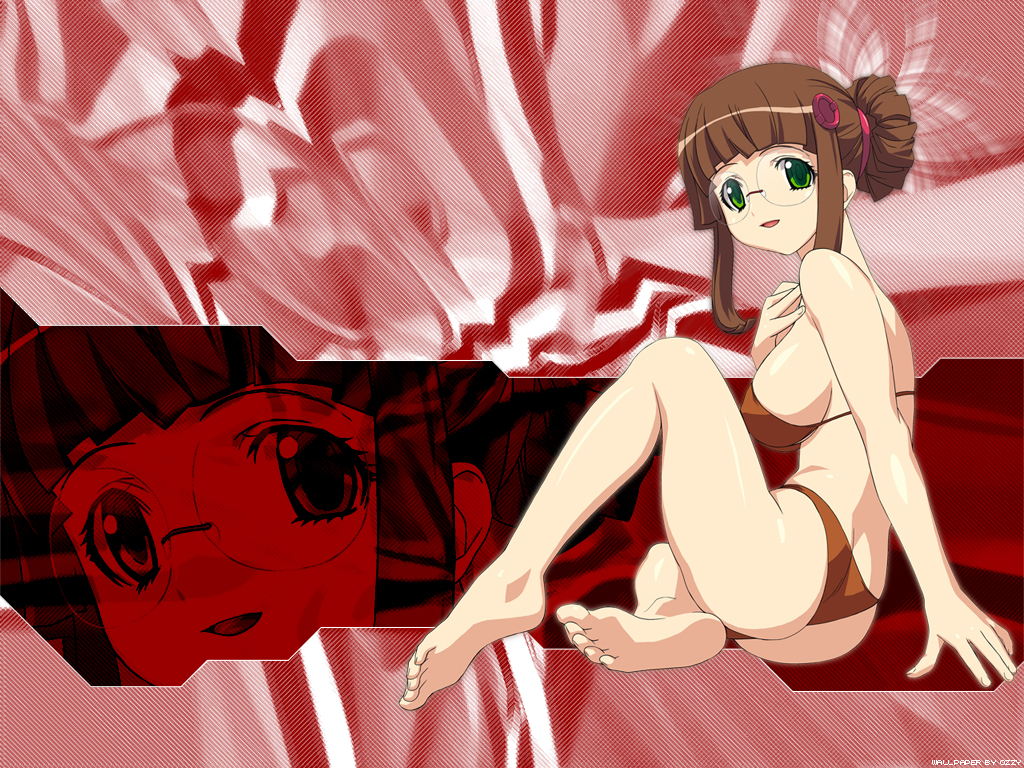 Description: A girl with a ponytail sitting on the ground next to a red background with a red background and a red background with a red background.