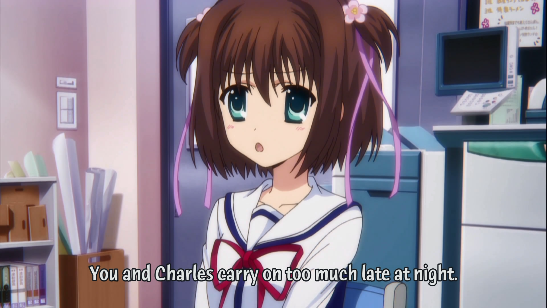 Description: A girl with a ponytail standing in a room with a desk and a computer monitor on it's side.
