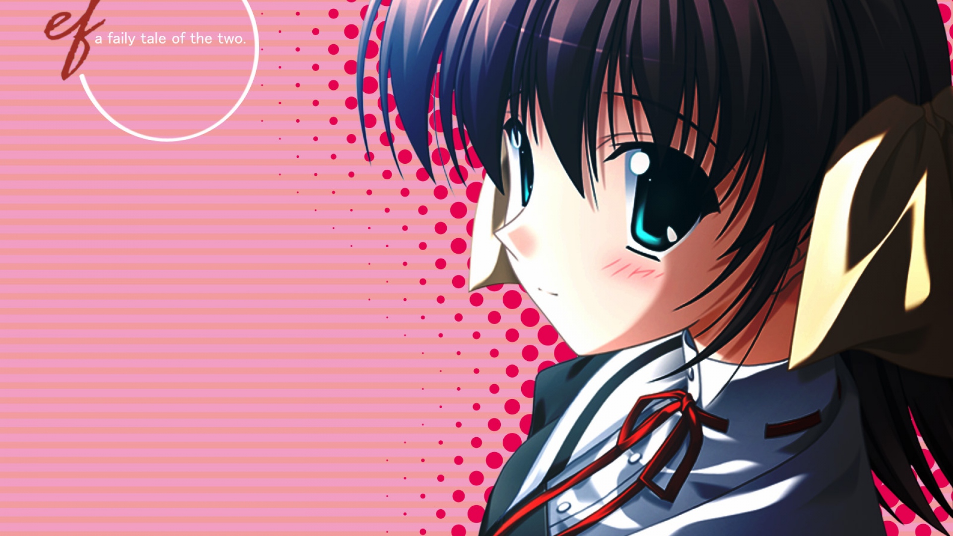 Description: A girl with a ponytail and a striped shirt is looking at the camera with a pink background and a pink background.