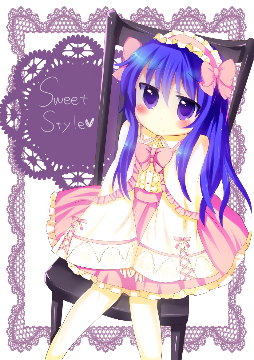 Description: A girl sitting in a chair with a purple dress on and a pink bow on her head and a purple lace border around her neck.