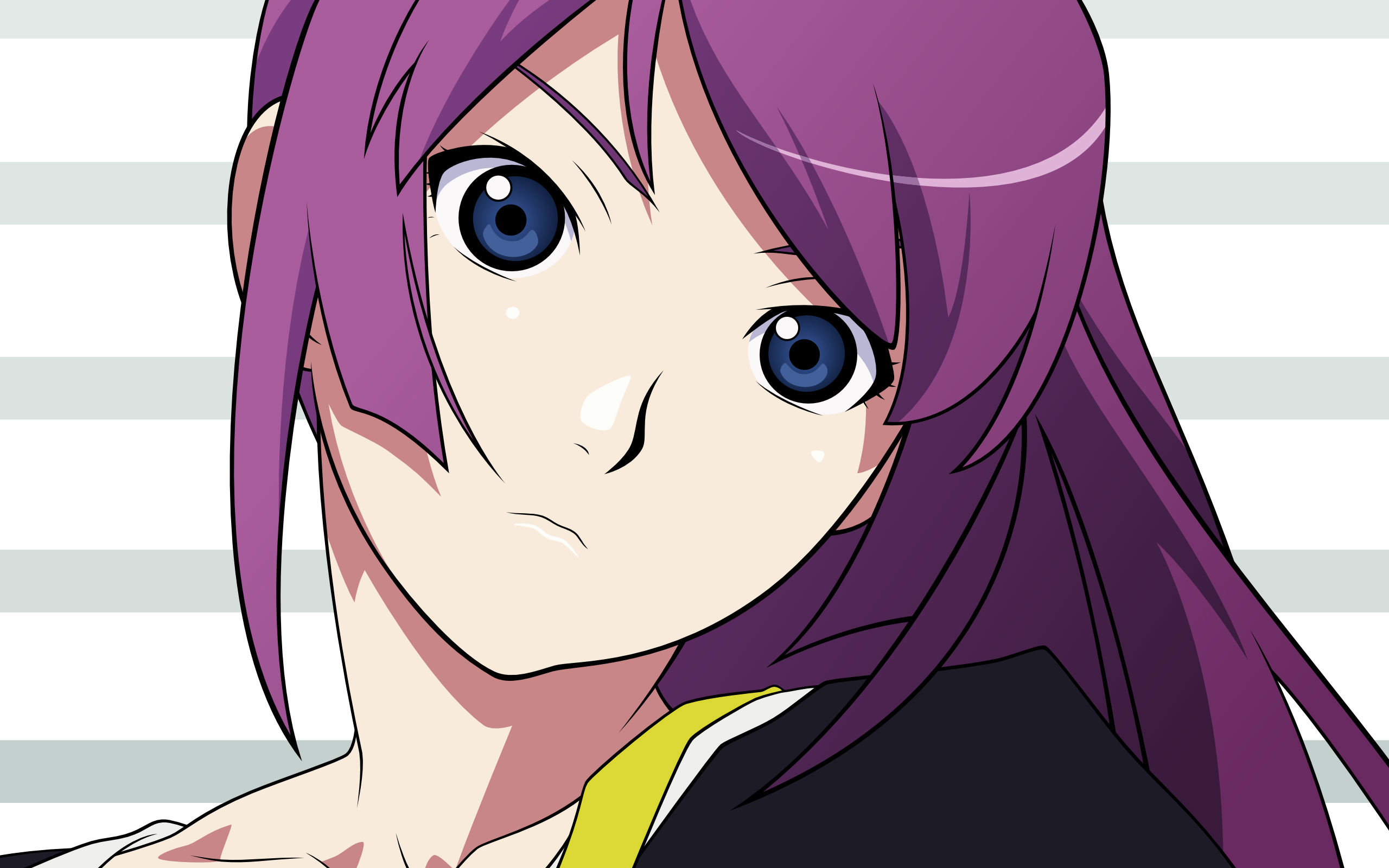 Description: A girl with purple hair and blue eyes is looking at the camera with a sad expression on her face.