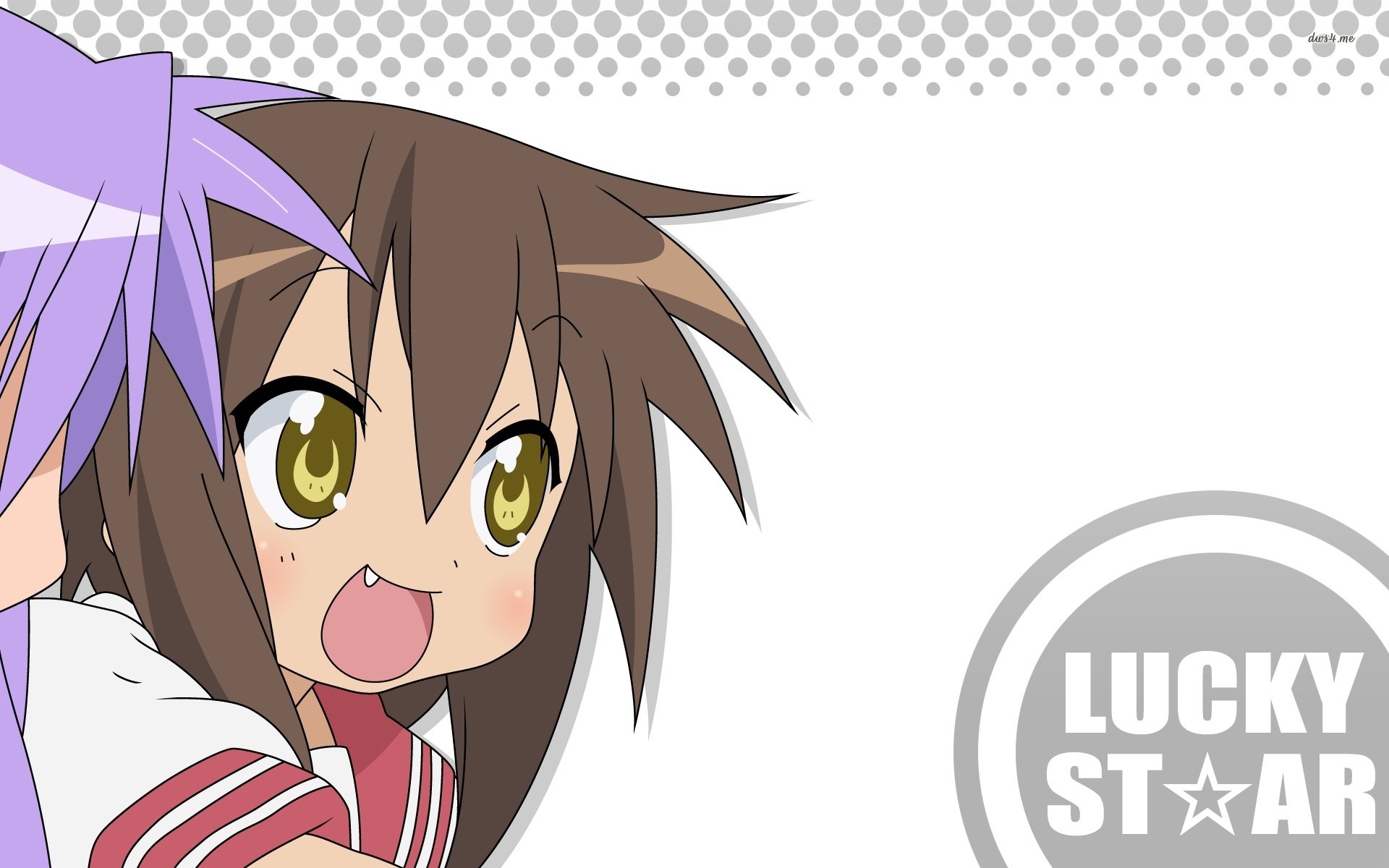 Description: A girl with a purple hair and a white shirt with a star on it and a lucky star sticker.