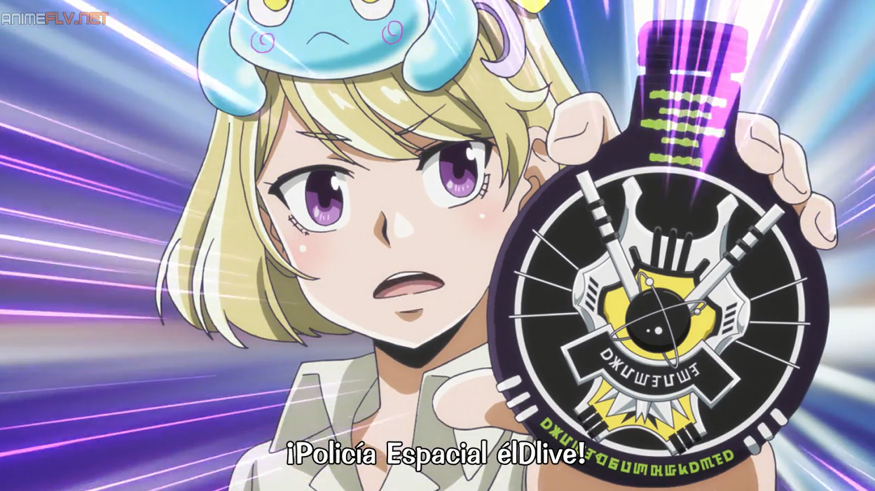 Description: A girl holding a black and white object in her hand with a purple background and a purple light behind her.