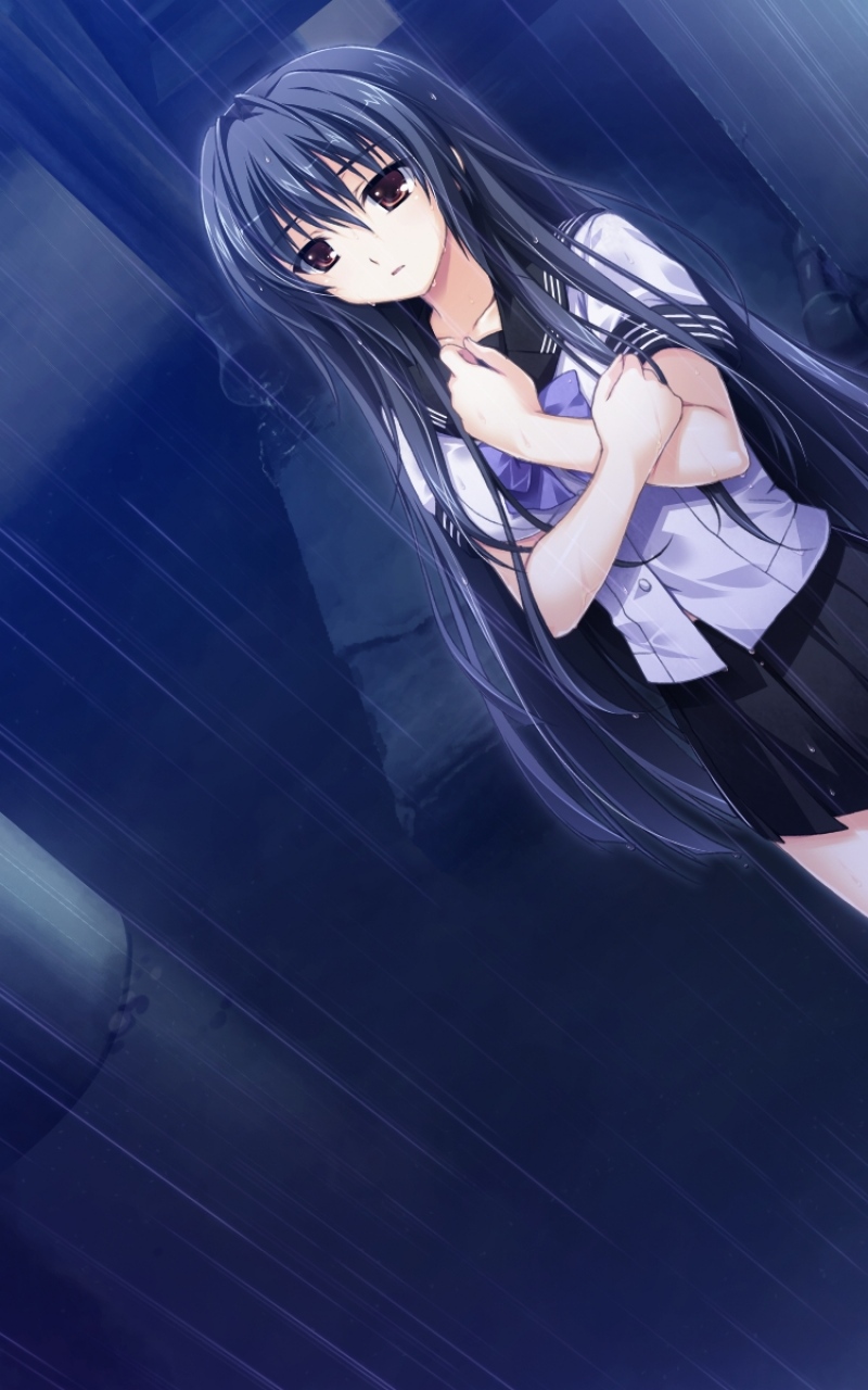 Description: A girl with long hair and a purple shirt is standing in a dark room with a blue background and a black and white background.