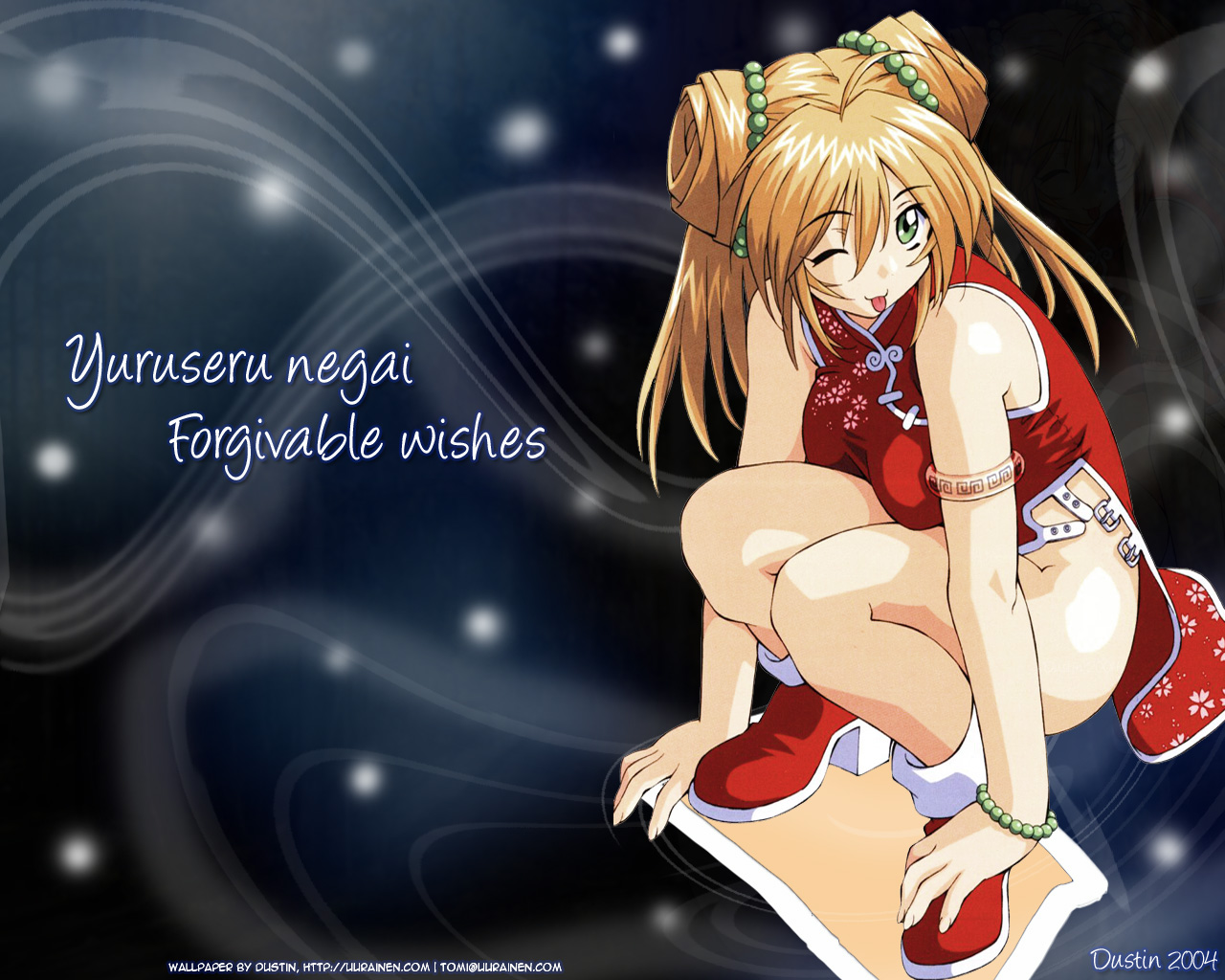 Description: A girl in a red dress kneeling down with her legs crossed and her head tilted back.