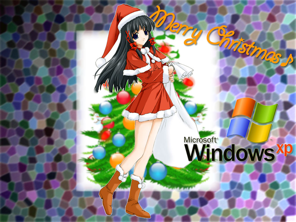 Description: A girl in a red dress and a santa hat standing in front of a christmas tree with windows xp.