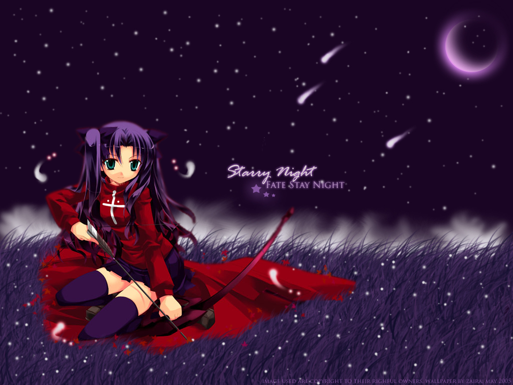 Description: A girl in a red dress sitting on a field with a sword in her hand and a moon in the background.