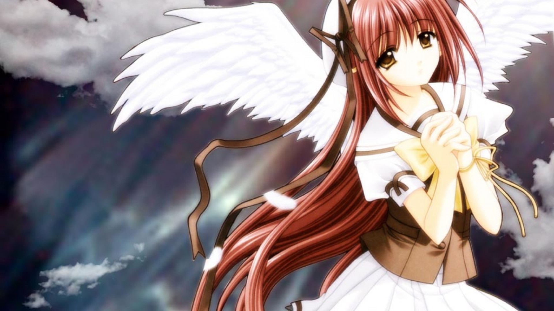 Description: A girl with long red hair and angel wings on her head.