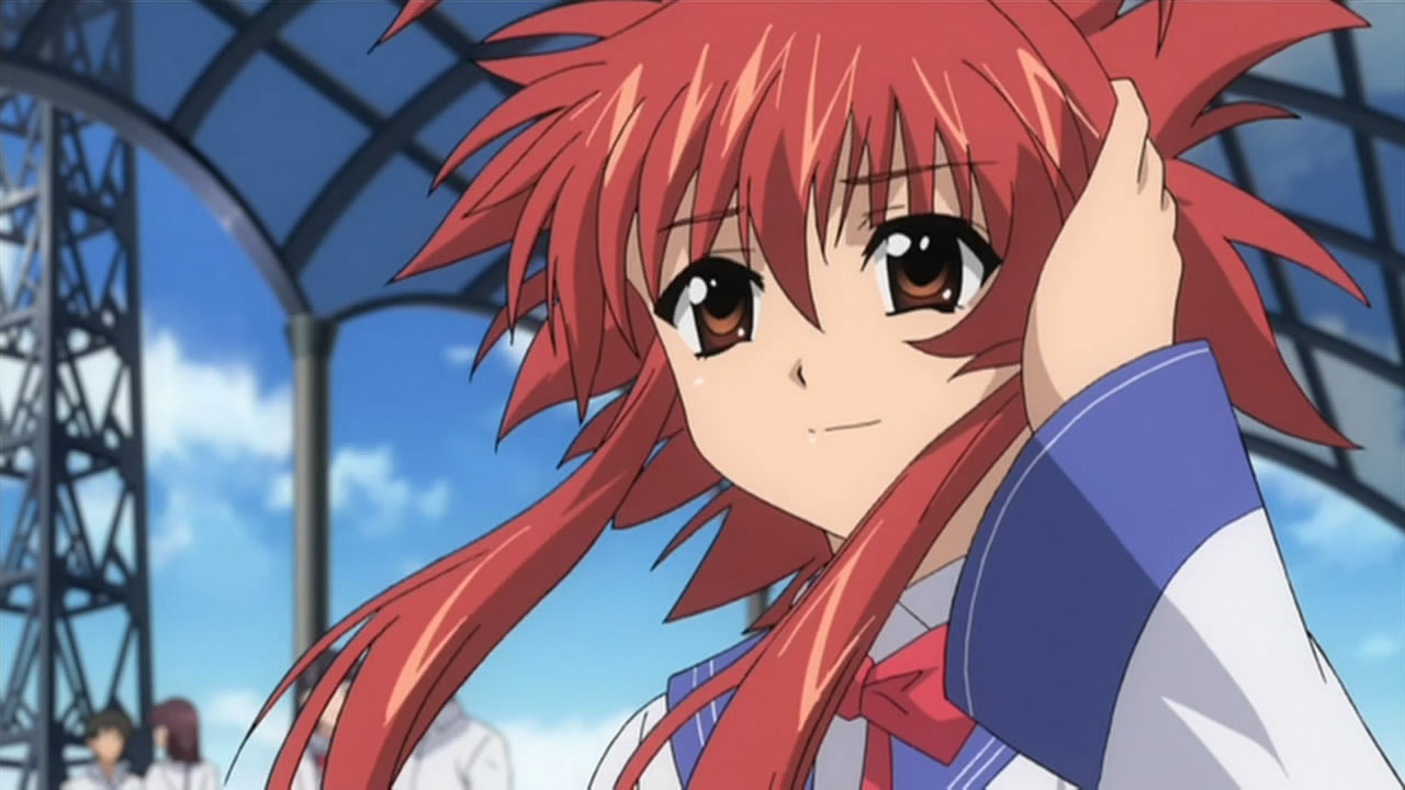 Description: A girl with red hair and a blue shirt is standing in front of a building with a sky background.