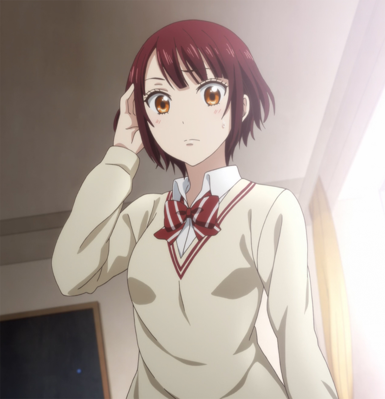 Description: A girl with red hair and a bow tie is standing in a room with a mirror and a door.