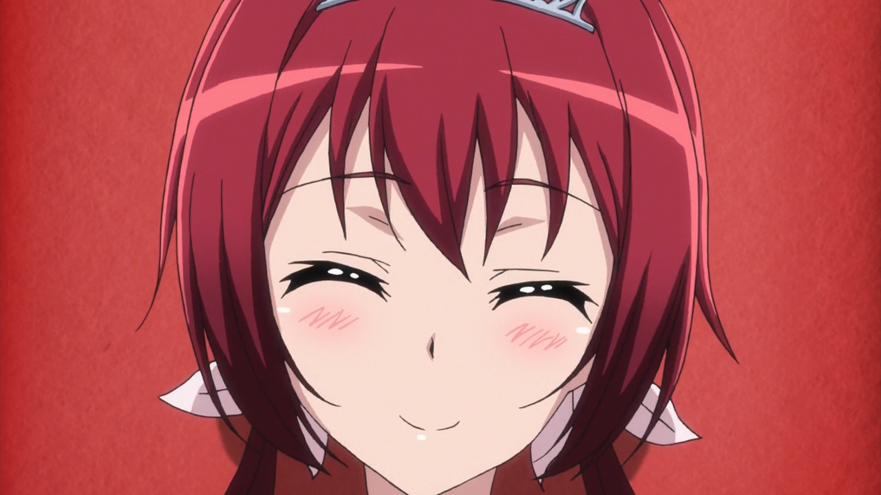 Description: A girl with red hair and a crown on her head is staring at the camera with a smile on her face.
