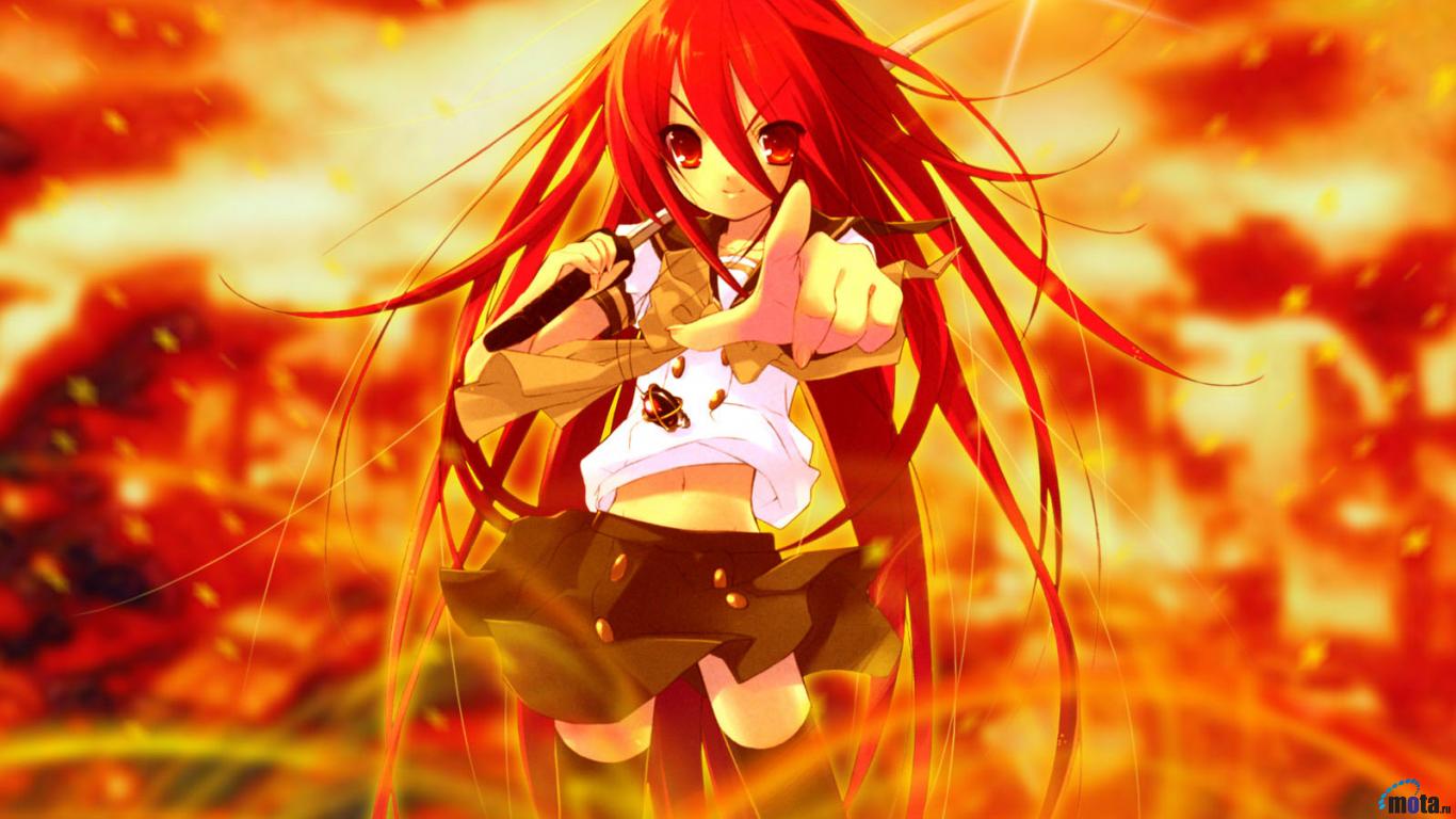 Description: A girl with red hair holding a microphone in front of a fire background with flames and smoke behind her.