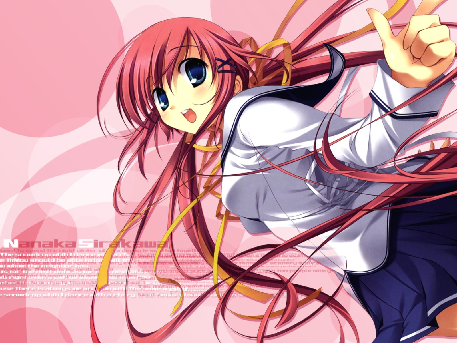 Description: A girl with long red hair pointing at something with her finger and a pink background with a pink circle.