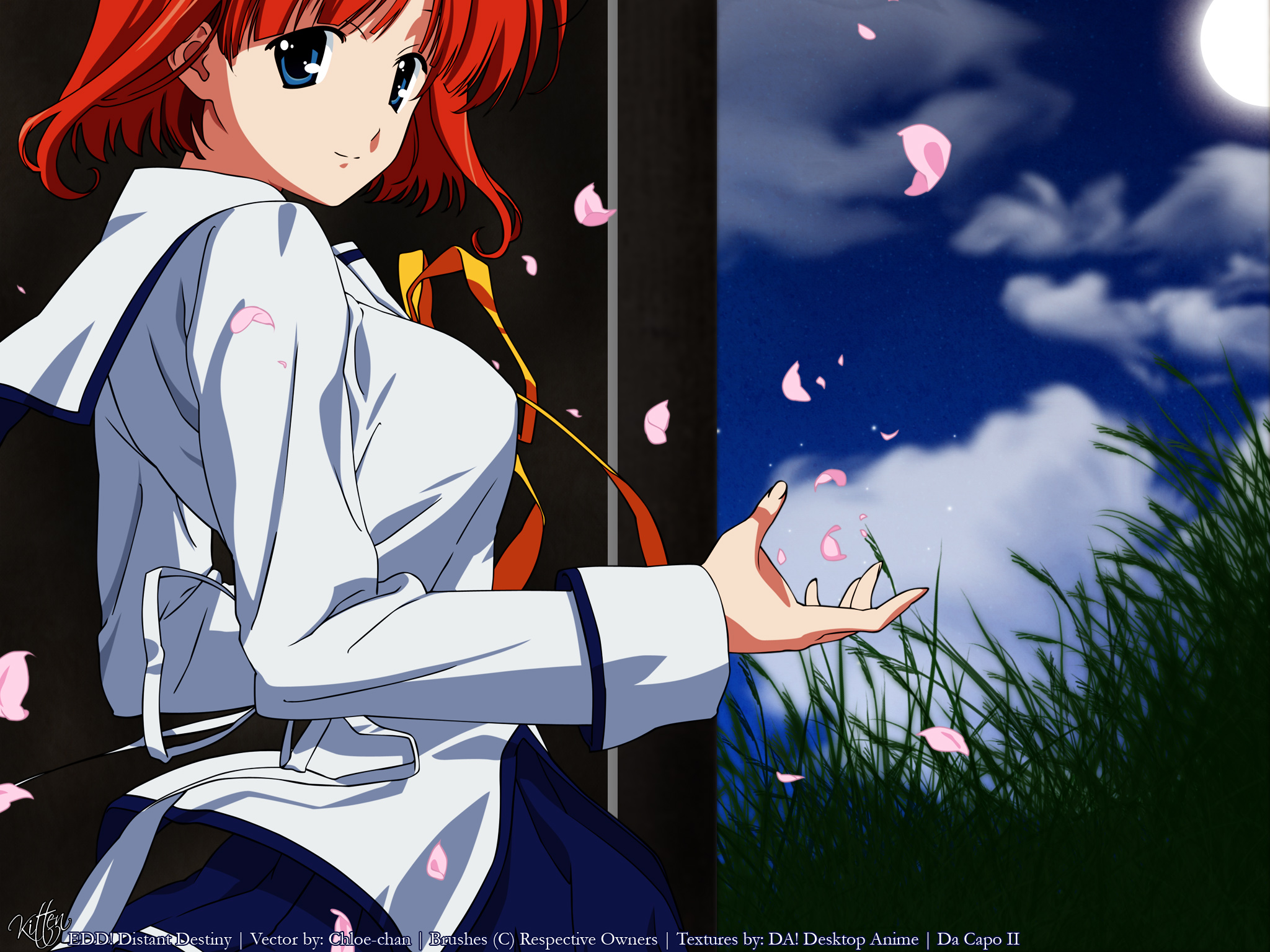 Description: A girl with red hair and a white shirt is standing in front of a window with pink petals on it.